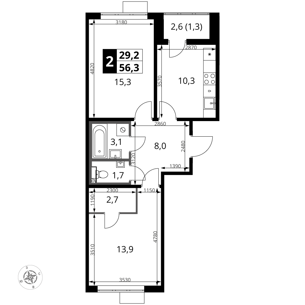 53.6 м² · 2 комнаты · 13/24 этаж · Март 2027