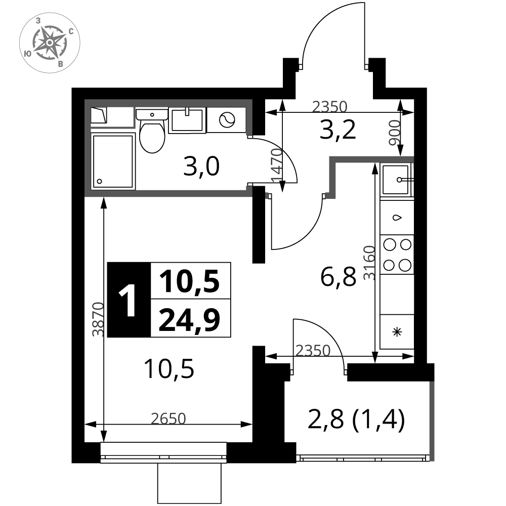 Продажа 1-комнатной квартиры № 4, 24.7 кв.м, этаж 7/25 в ЖК "1-й Южный"