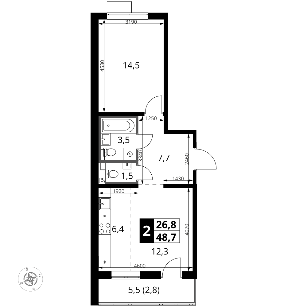 48.5 м² · 2 комнаты · 24/24 этаж · Март 2027