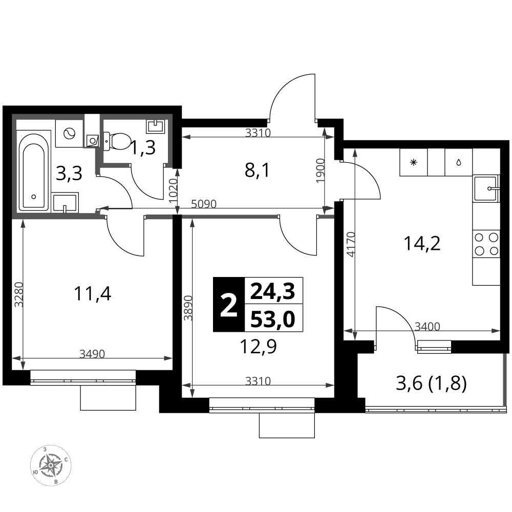 53 м² · 2 комнаты · 2/24 этаж · Март 2027