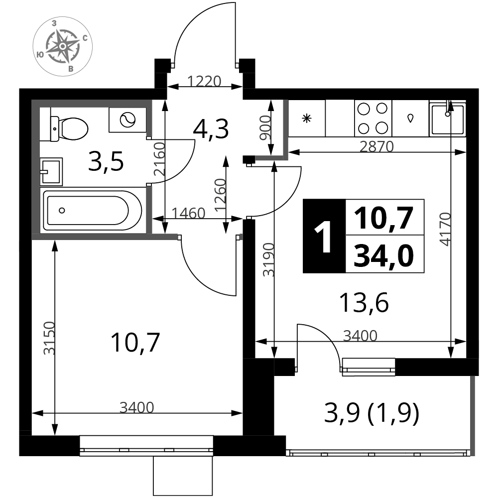 34 м² · 1 комната · 2/25 этаж · Июнь 2026