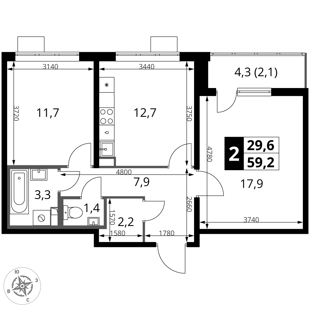 59.1 м² · 2 комнаты · 15/25 этаж · Объект сдан