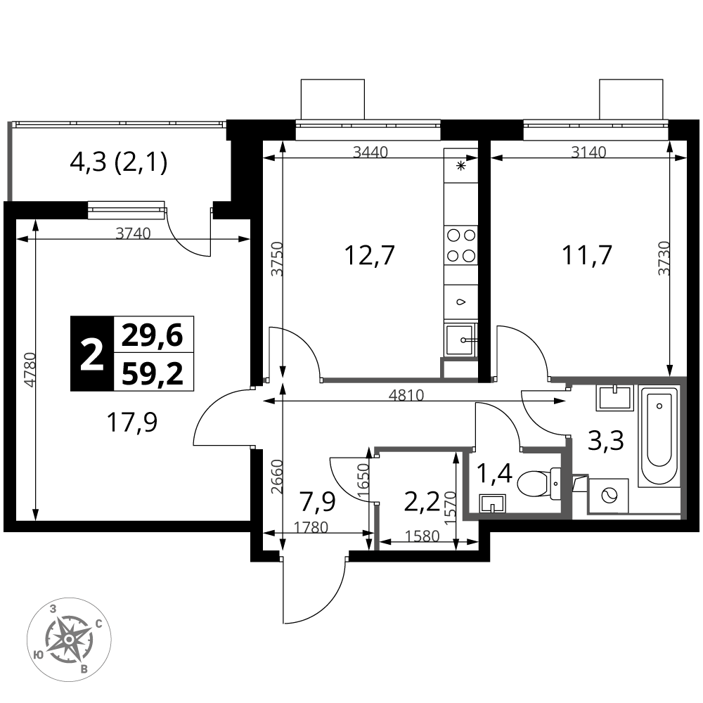 ГлавнаяЖилая недвижимостьЖК «1-й Южный»2-комнатная квартира № 4