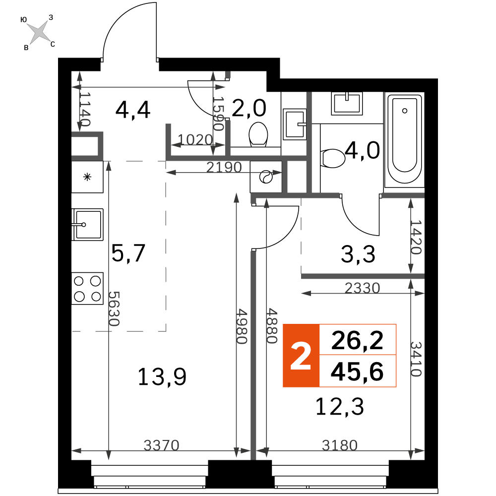 | 5 | Июнь 2028 | 1 | 45 | 9 | 9 | 2 | 55.8 | 45 887 130 | без отделки | ![]() | 9 | ||
