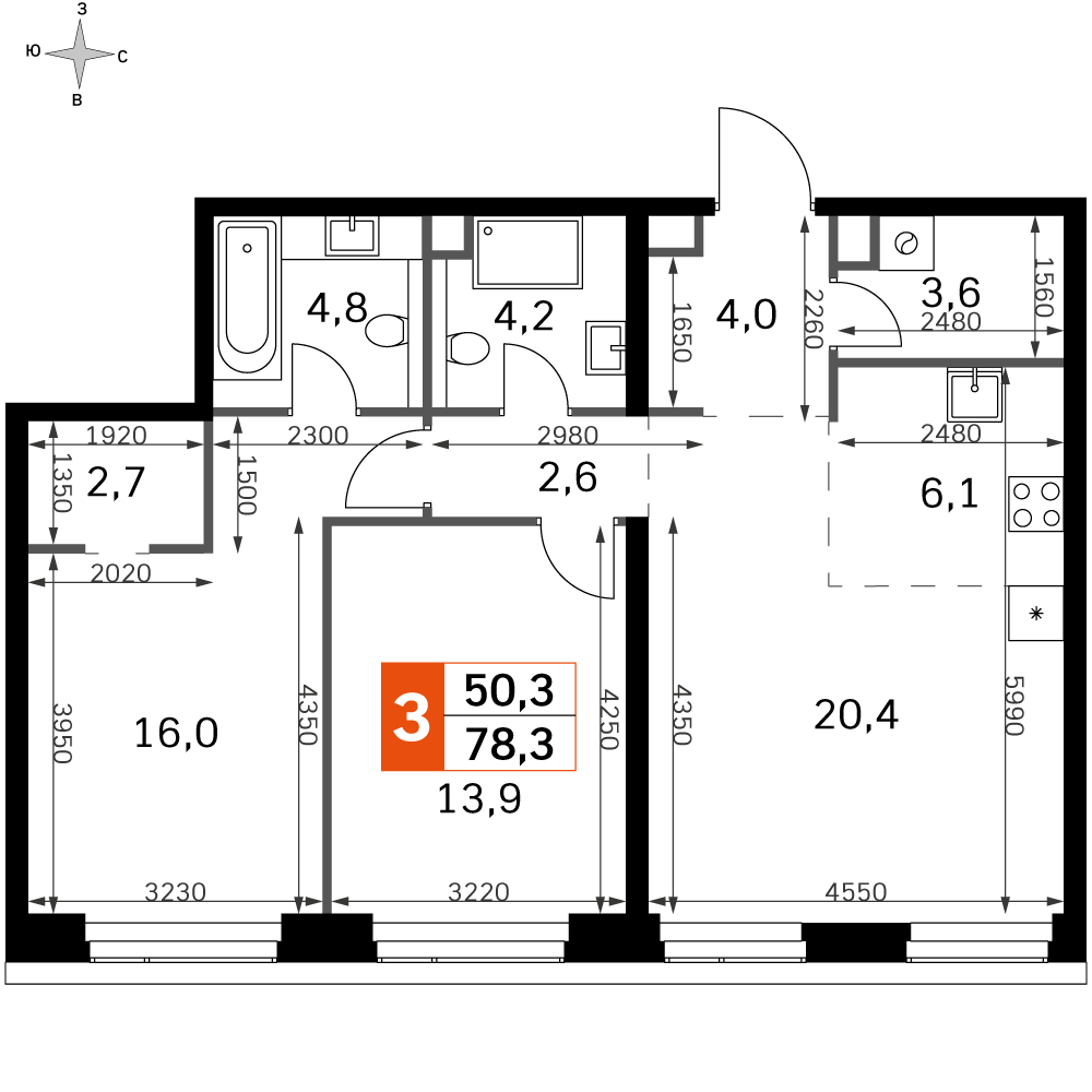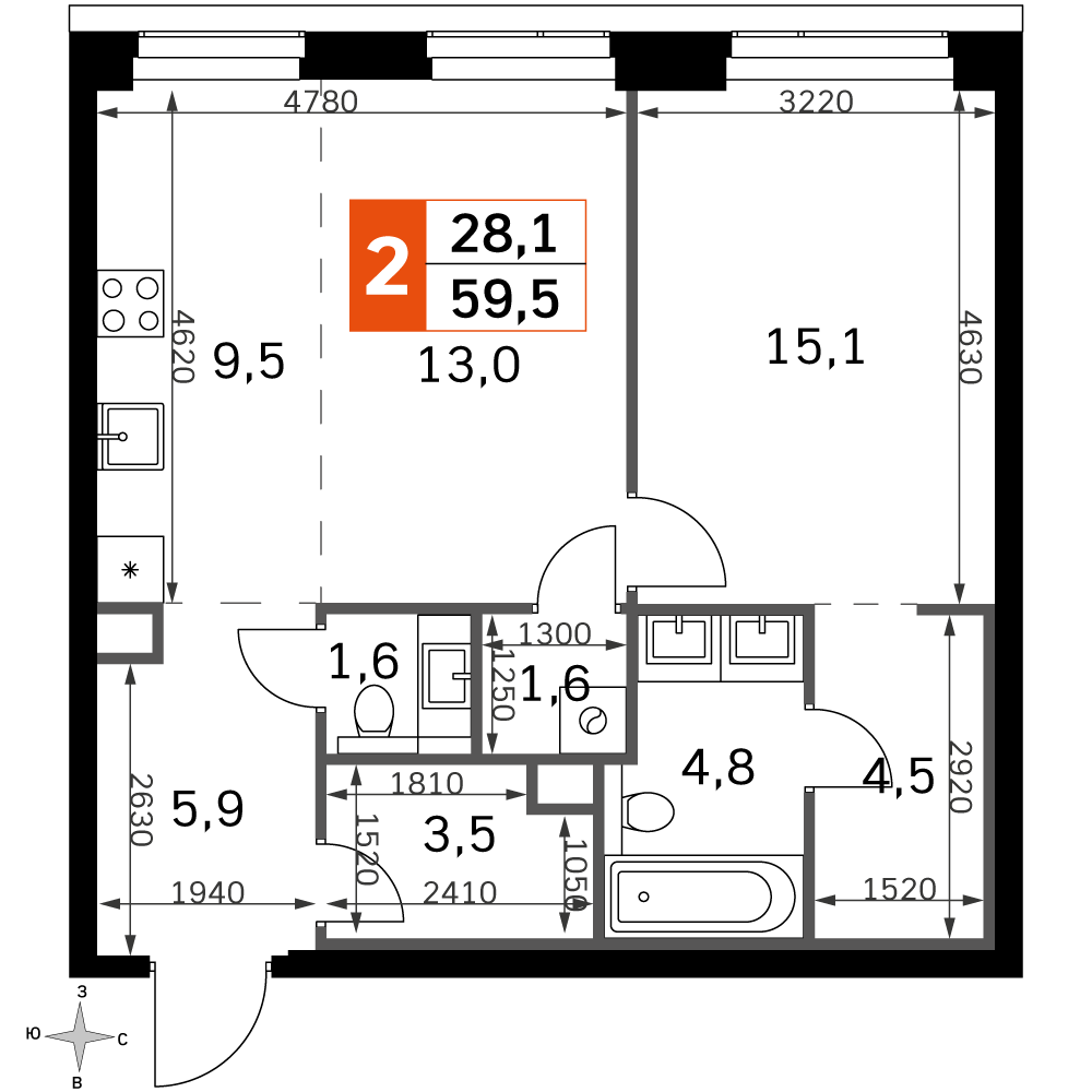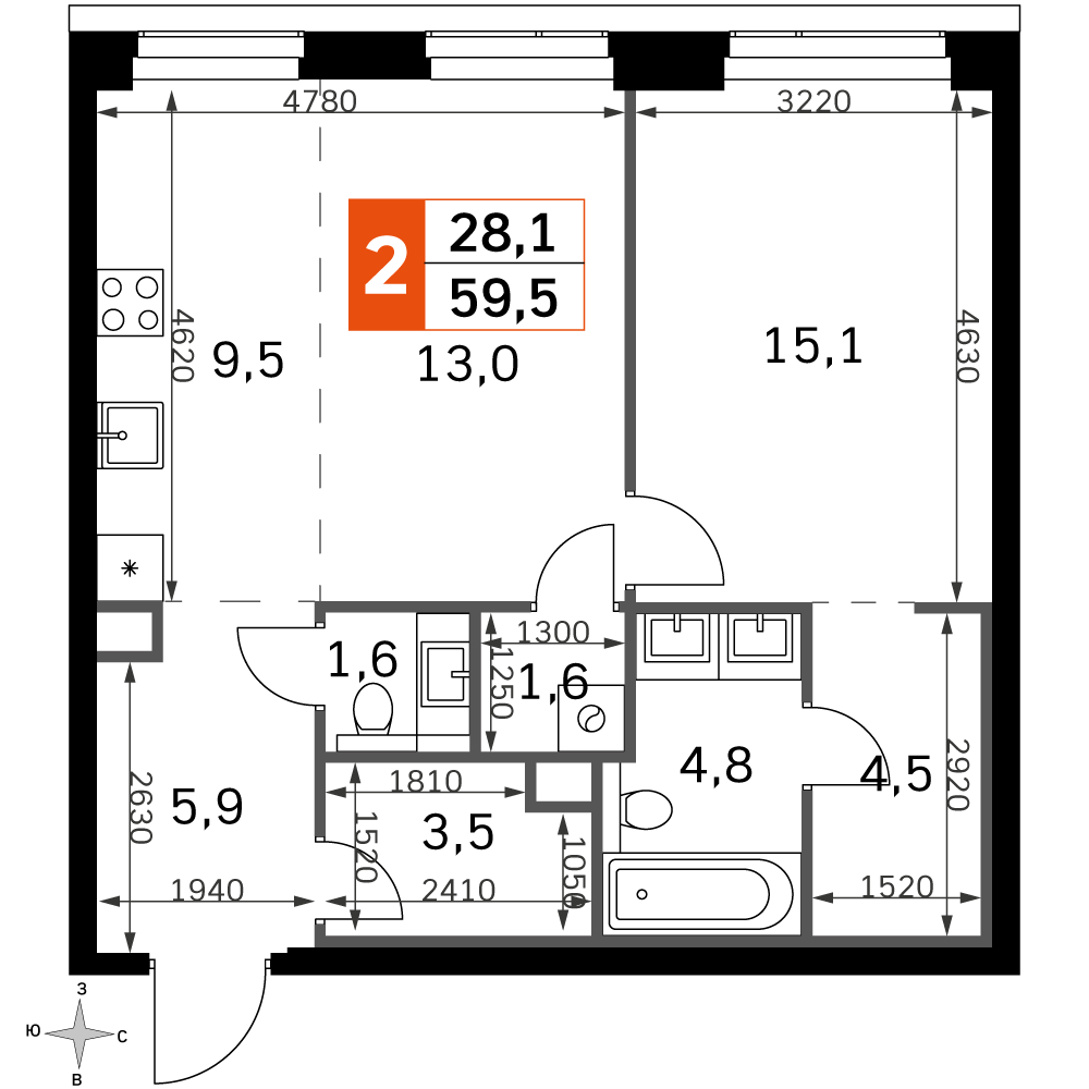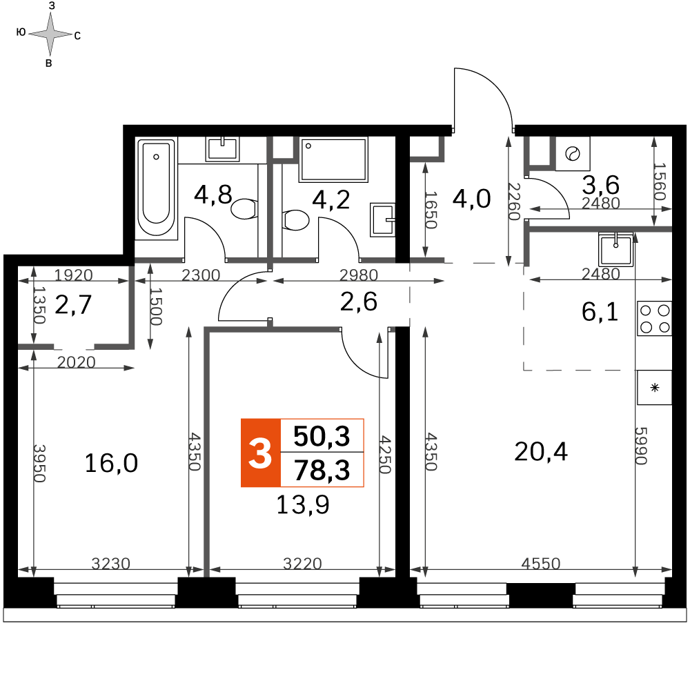 | 5 | Июнь 2028 | 1 | 48 | 3 | 3 | 2 | 58.8 | 48 515 880 | без отделки | ![]() | 3 | ||