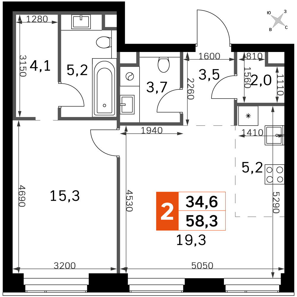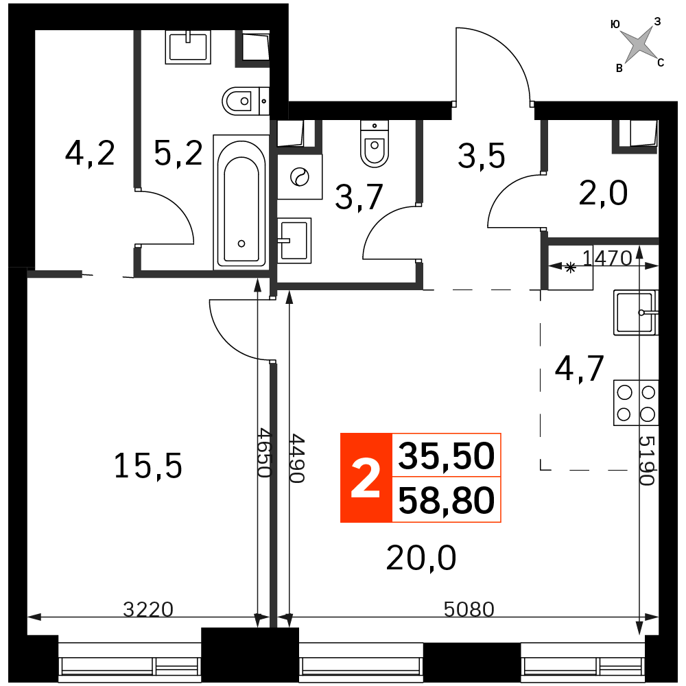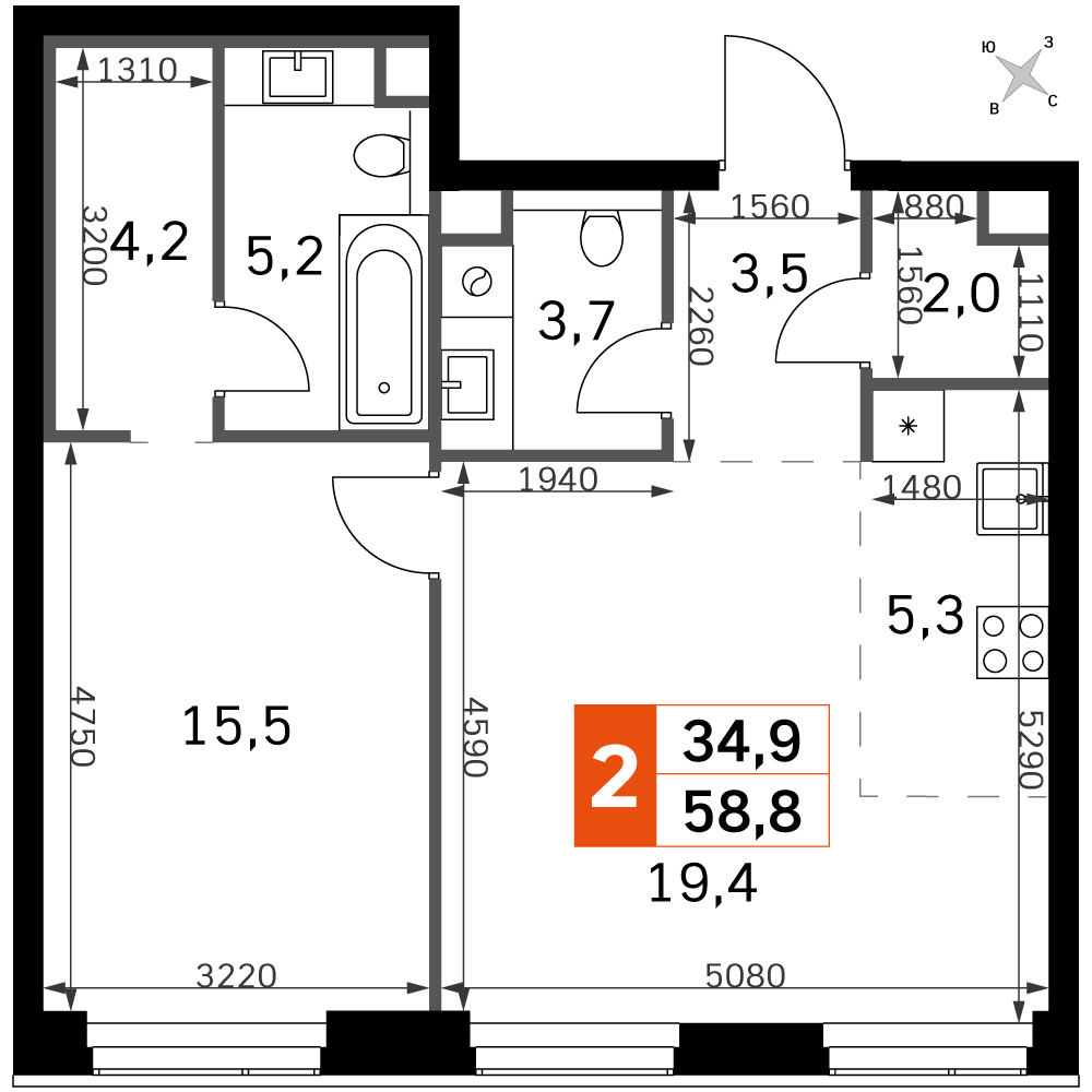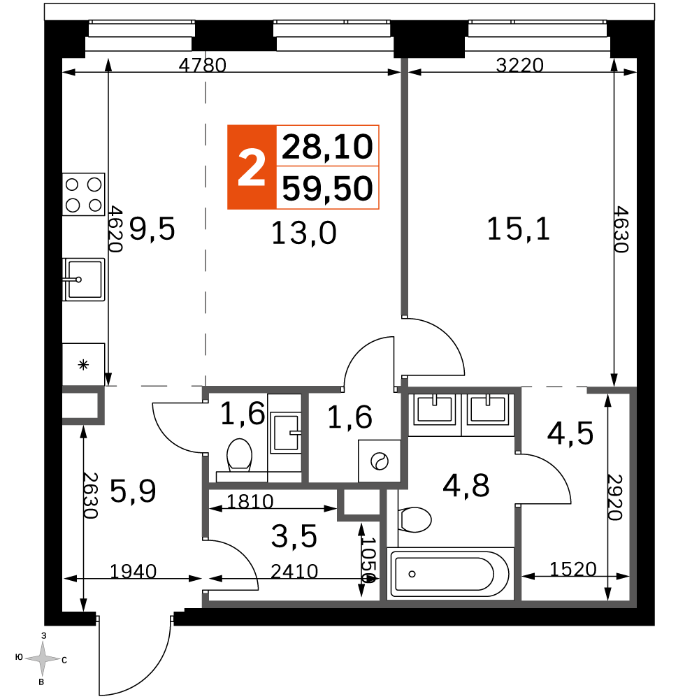 | 5 | Июнь 2028 | 1 | 48 | 3 | 3 | 2 | 58.8 | 48 515 880 | без отделки | ![]() | 3 | ||