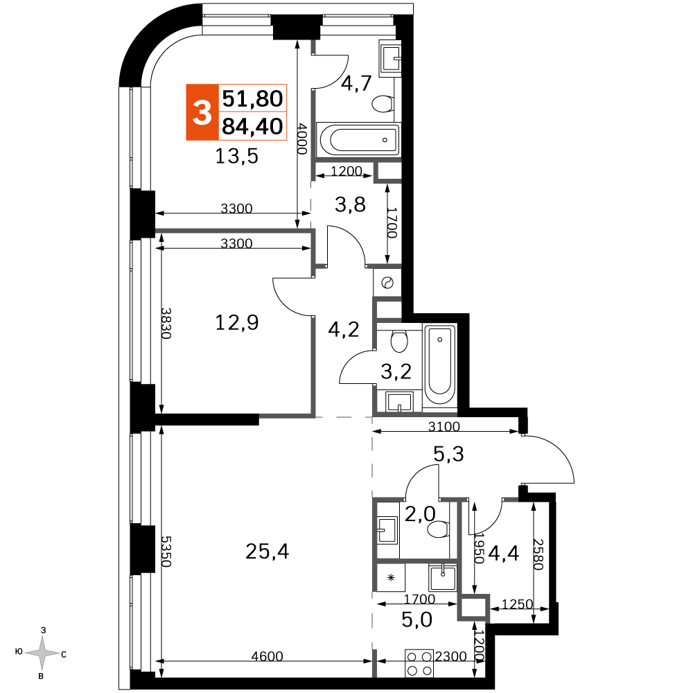 | 5 | Июнь 2028 | 1 | 12 | 13 | 13 | 4 | 86 | 69 152 600 | без отделки | 13 | |||