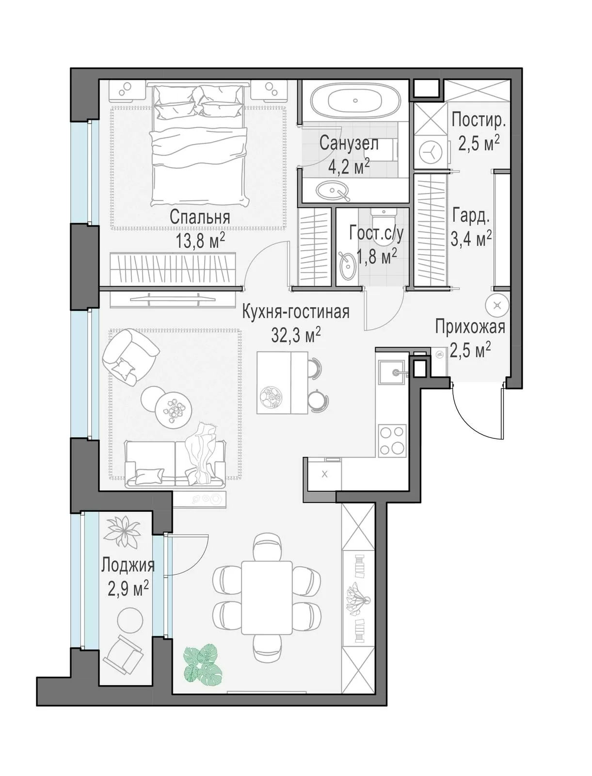 • Более 70 видов планировок — от студий до просторных трёхкомнатных квартир с мастер-спальнями и гостевыми санузлами.
