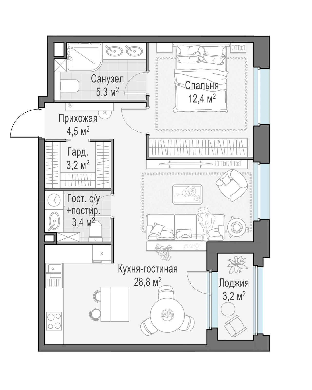 • Более 70 видов планировок — от студий до просторных трёхкомнатных квартир с мастер-спальнями и гостевыми санузлами.