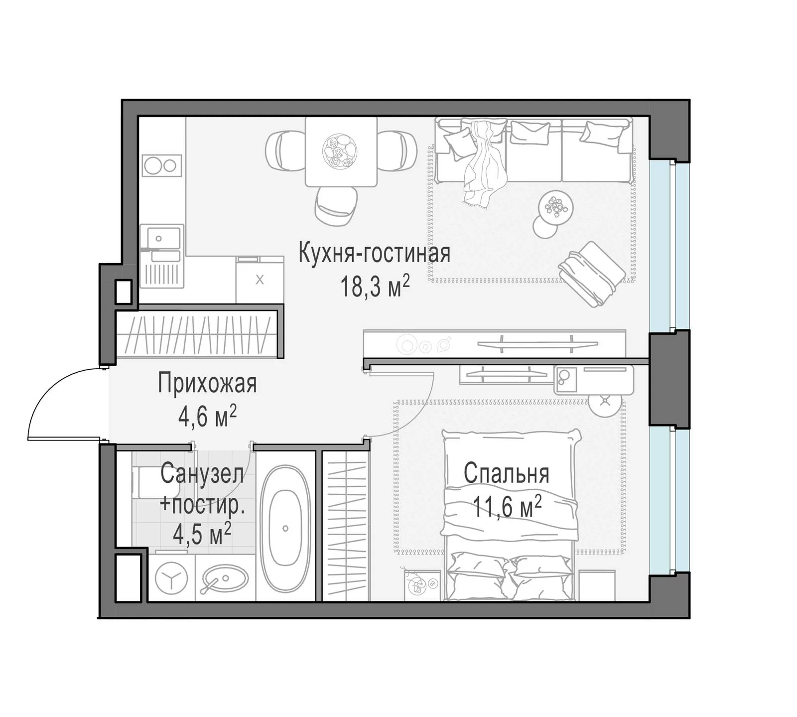 • Более 70 видов планировок — от студий до просторных трёхкомнатных квартир с мастер-спальнями и гостевыми санузлами.