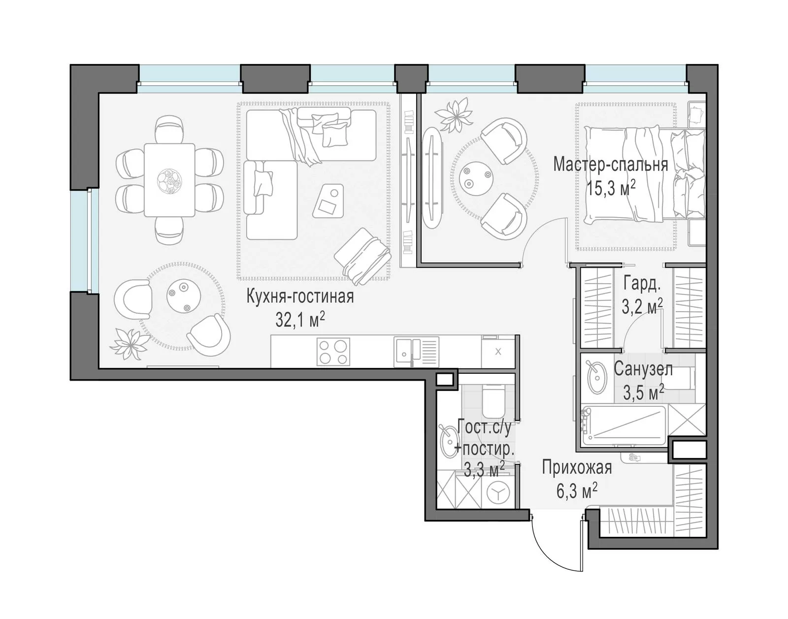 • Более 70 видов планировок — от студий до просторных трёхкомнатных квартир с мастер-спальнями и гостевыми санузлами.