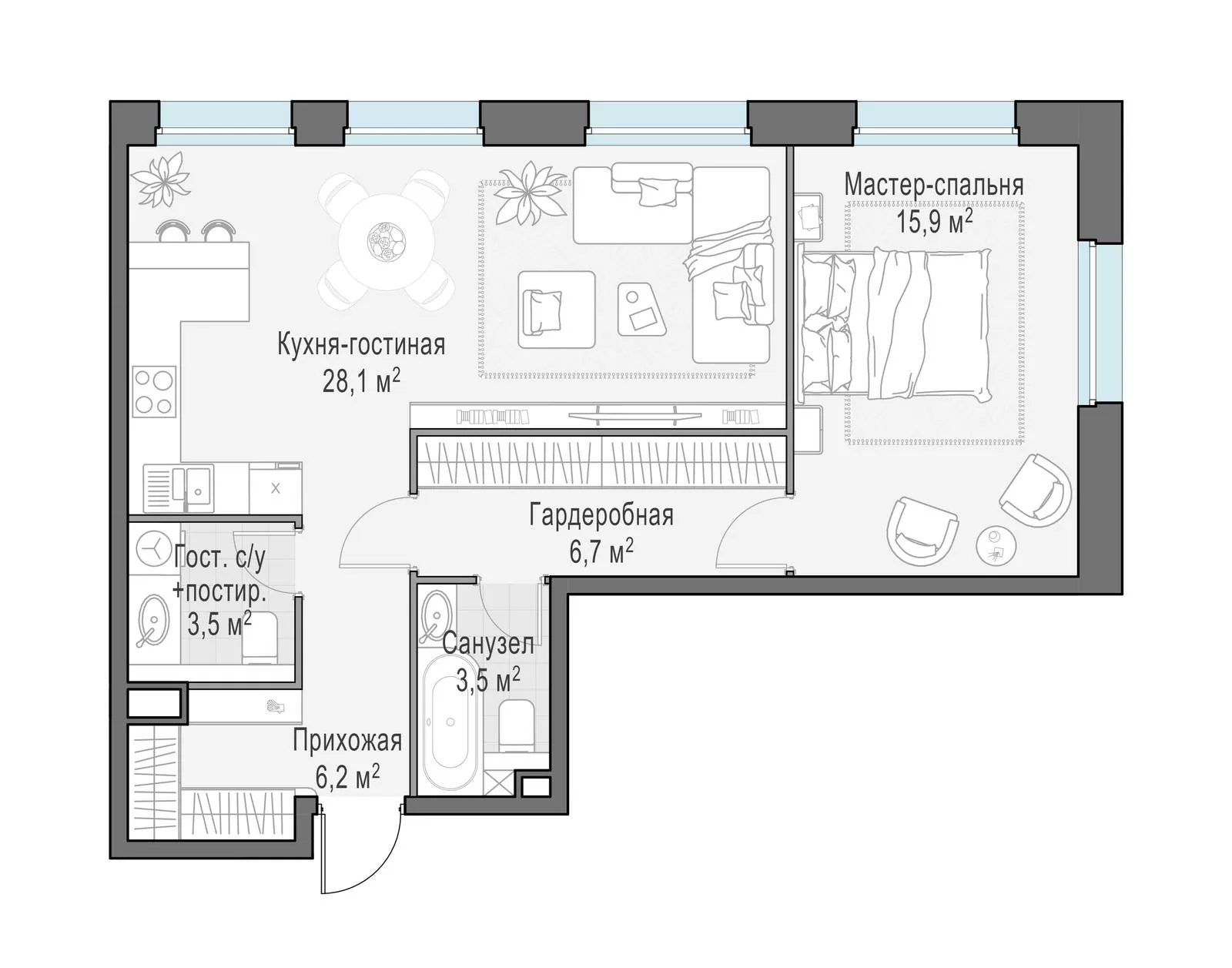 • Более 70 видов планировок — от студий до просторных трёхкомнатных квартир с мастер-спальнями и гостевыми санузлами.
