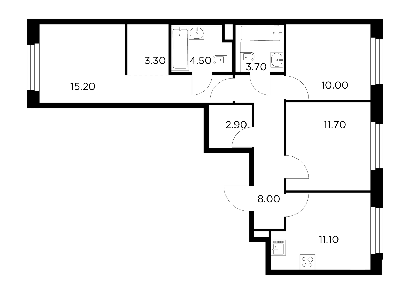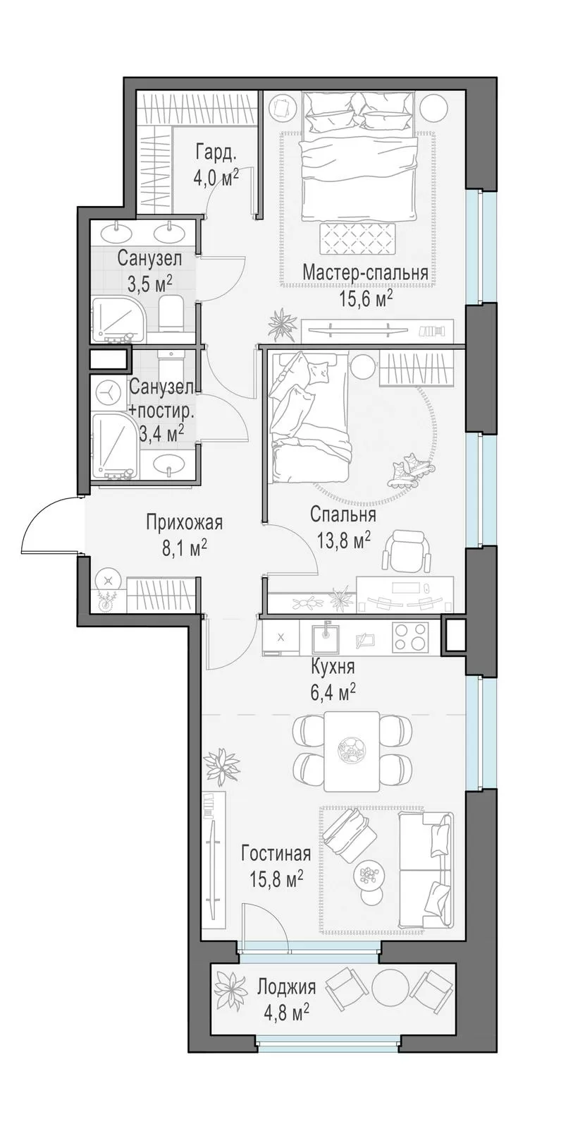 • Более 70 видов планировок — от студий до просторных трёхкомнатных квартир с мастер-спальнями и гостевыми санузлами.
