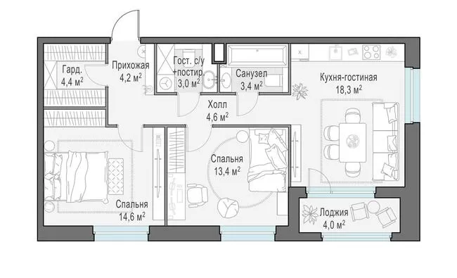 • Более 70 видов планировок — от студий до просторных трёхкомнатных квартир с мастер-спальнями и гостевыми санузлами.