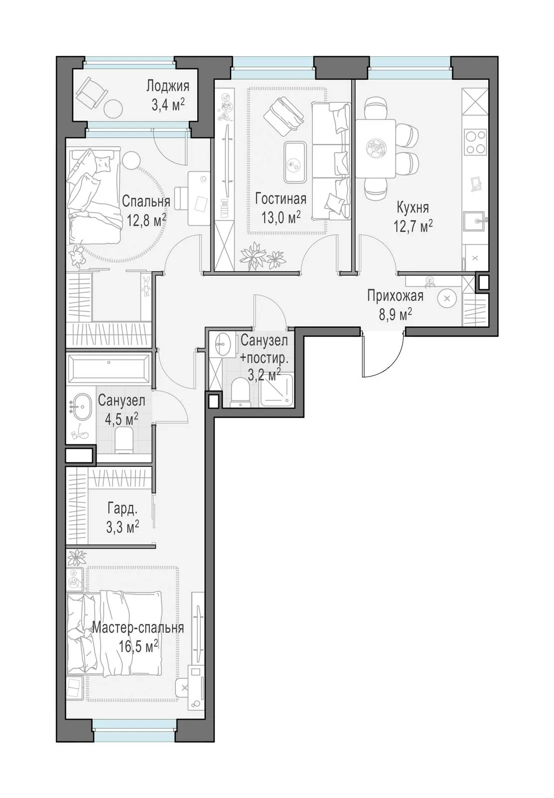 • Более 70 видов планировок — от студий до просторных трёхкомнатных квартир с мастер-спальнями и гостевыми санузлами.