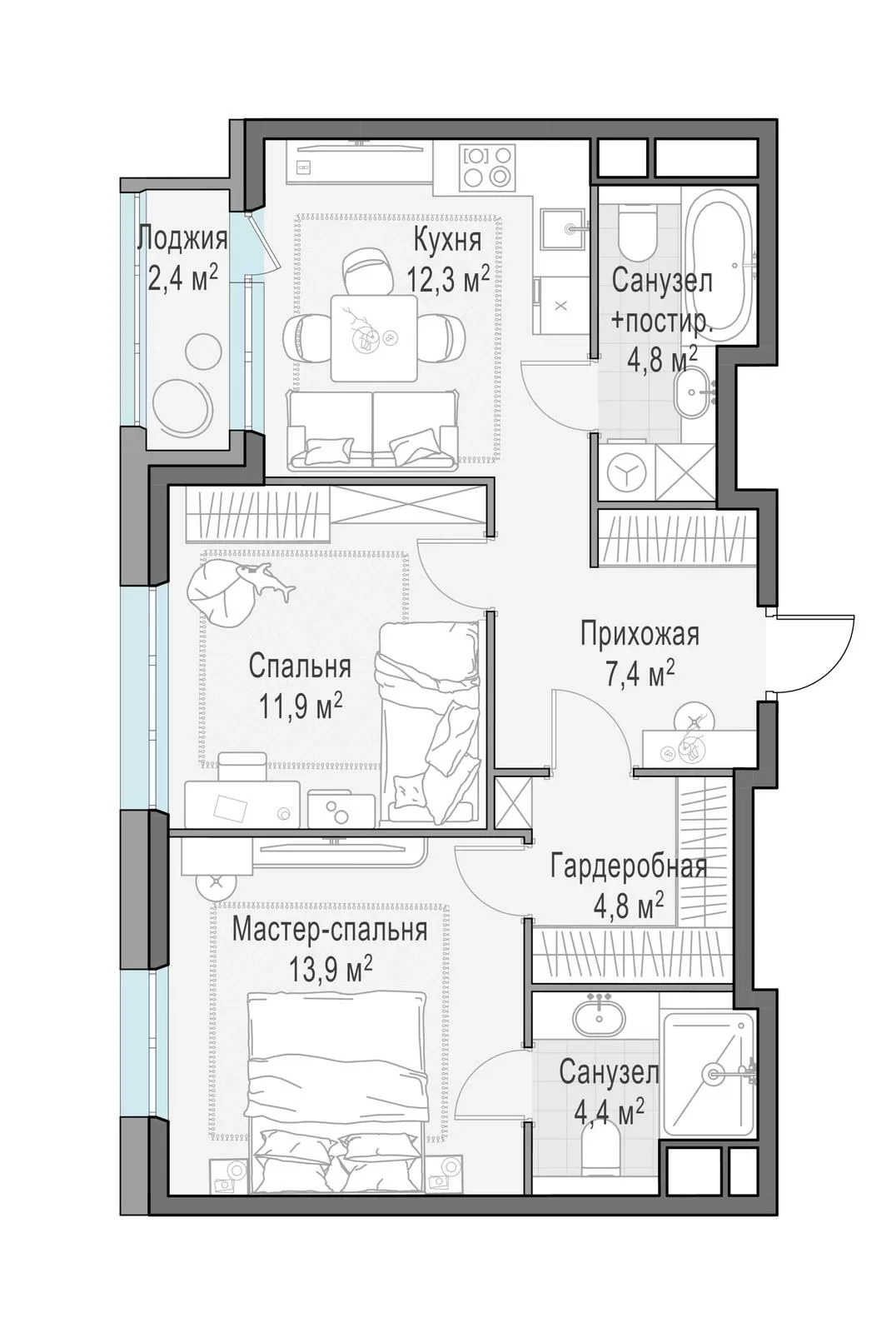 Продажа 2-комнатной квартиры № 1, 60.9 кв.м, этаж 12/1 в ЖК «Филатов Луг»