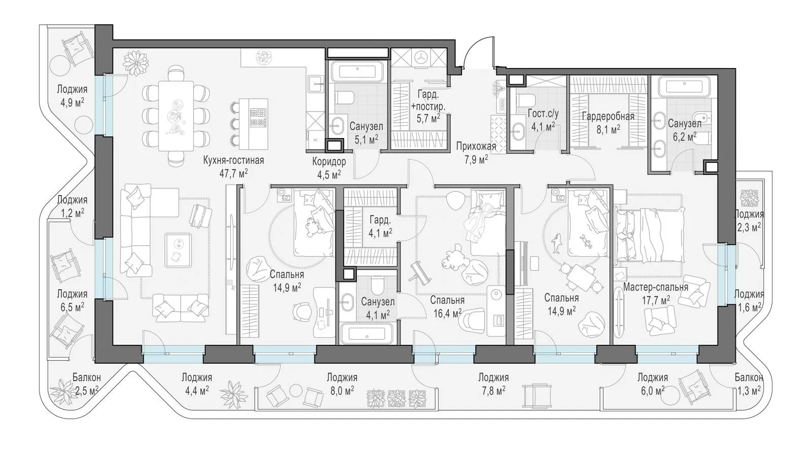 179 м² · 4 комнаты · 13/18 этаж · Объект сдан