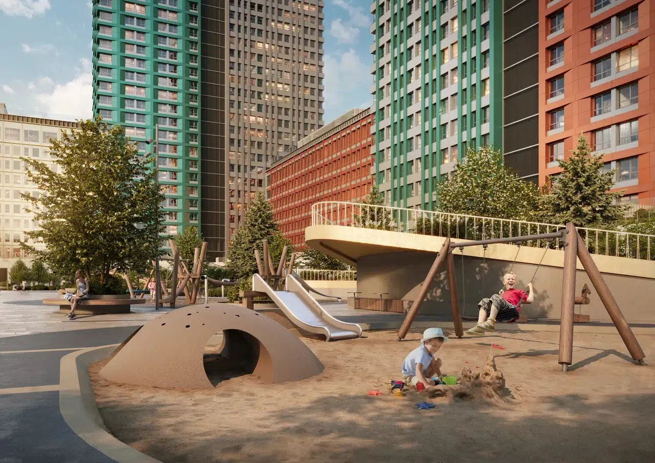 Благоустройство территории ЖК Injoy выведено на уровень приватного городского парка. Пространство организовано вокруг центрального 800-метрового бульвара, который разделен на тематические зоны для спорта, игр и тихого отдыха. Здесь есть все: площадки для командных игр и воркаута, беговые дорожки, зоны для йоги, современные детские городки для разных возрастов и уединенные аллеи для прогулок. Отдельно обустроена огороженная площадка для выгула собак. Закрытый внутренний двор продолжает эту концепцию, предлагая дополнительное озелененное пространство с детскими площадками и променадом на втором уровне.