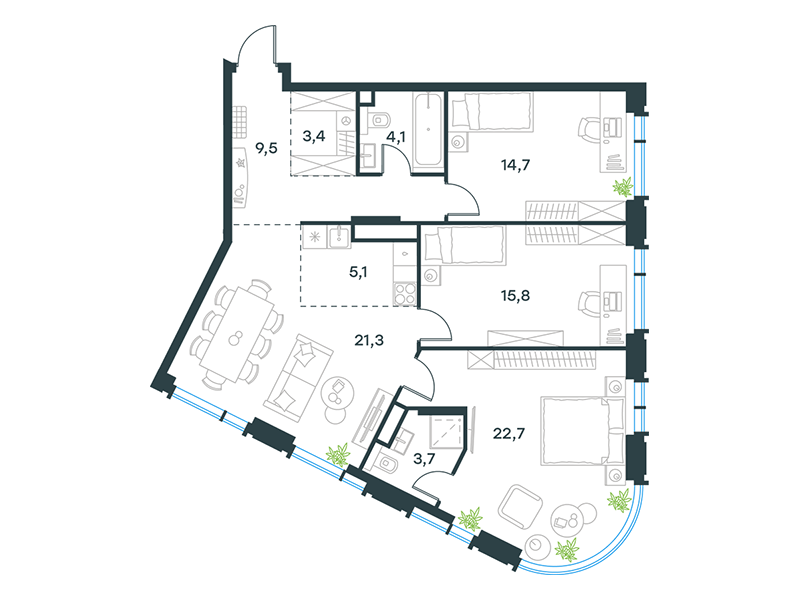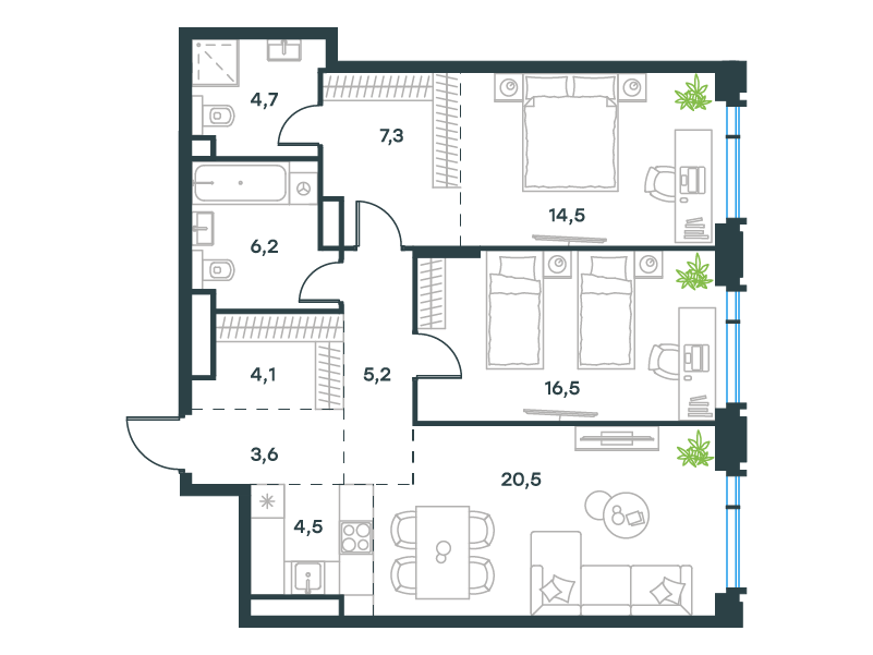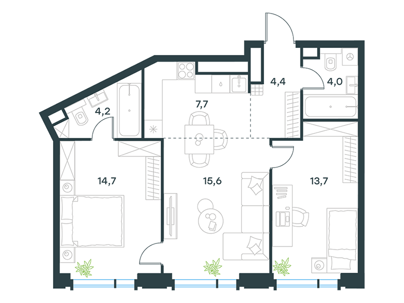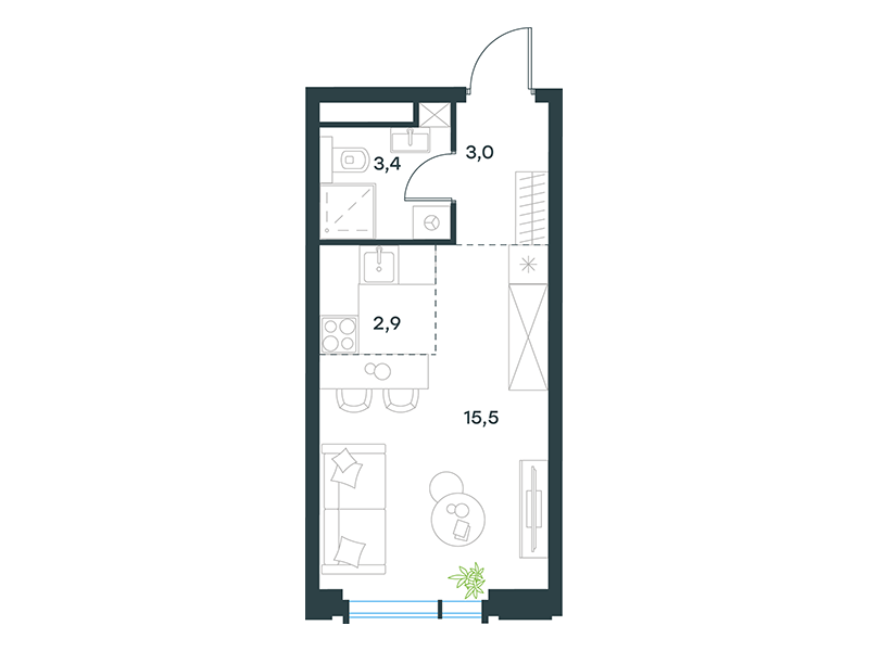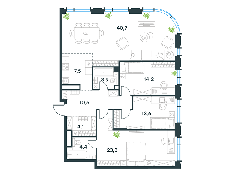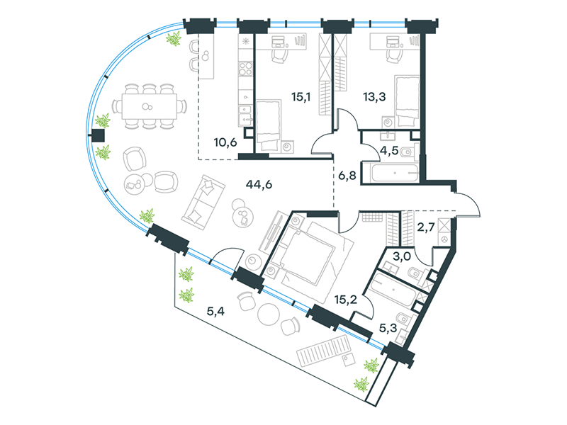 Особой эксклюзивностью обладают квартиры второго этажа, имеющие прямой выход в личные патио – озелененные дворики в общем пространстве стилобата. Эти приватные террасы становятся идеальным местом для утреннего кофе, семейных обедов или уединенного отдыха в собственном зеленом уголке, не покидая охраняемой территории.
