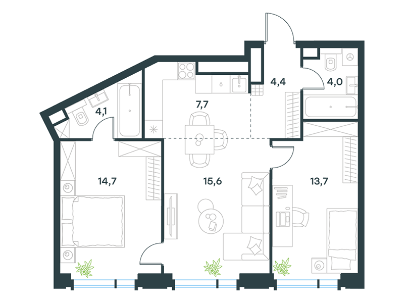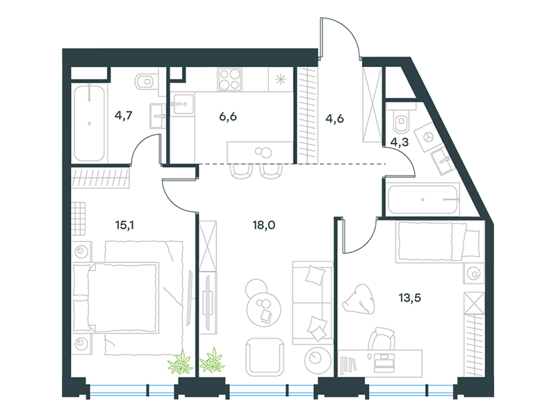 Проект предлагает свыше 20 уникальных планировочных решений площадью от 18 до 143 м², включая редкие форматы: квартиры с окнами в ванных комнатах, возможностью установки камина и трехсторонним остеклением. Особый шарм представляют квартиры на втором этаже с выходом в приватное патио в общем дворе-стилобате.