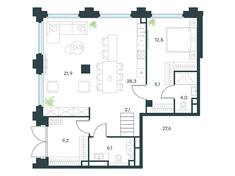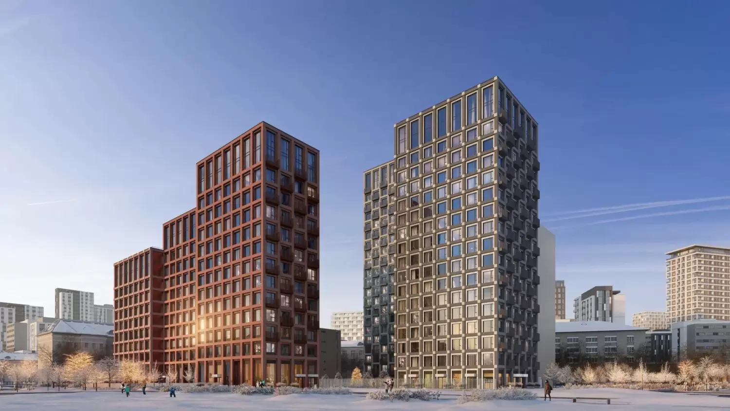 Единая дизайнерская концепция прослеживается от фасадов до интерьеров. Стильные лобби с высокими потолками (до 3,9 м) и панорамным остеклением продолжают тему геометричности и упорядоченности. В их отделке используются премиальные и экологичные материалы: металл, стекло, керамогранит.