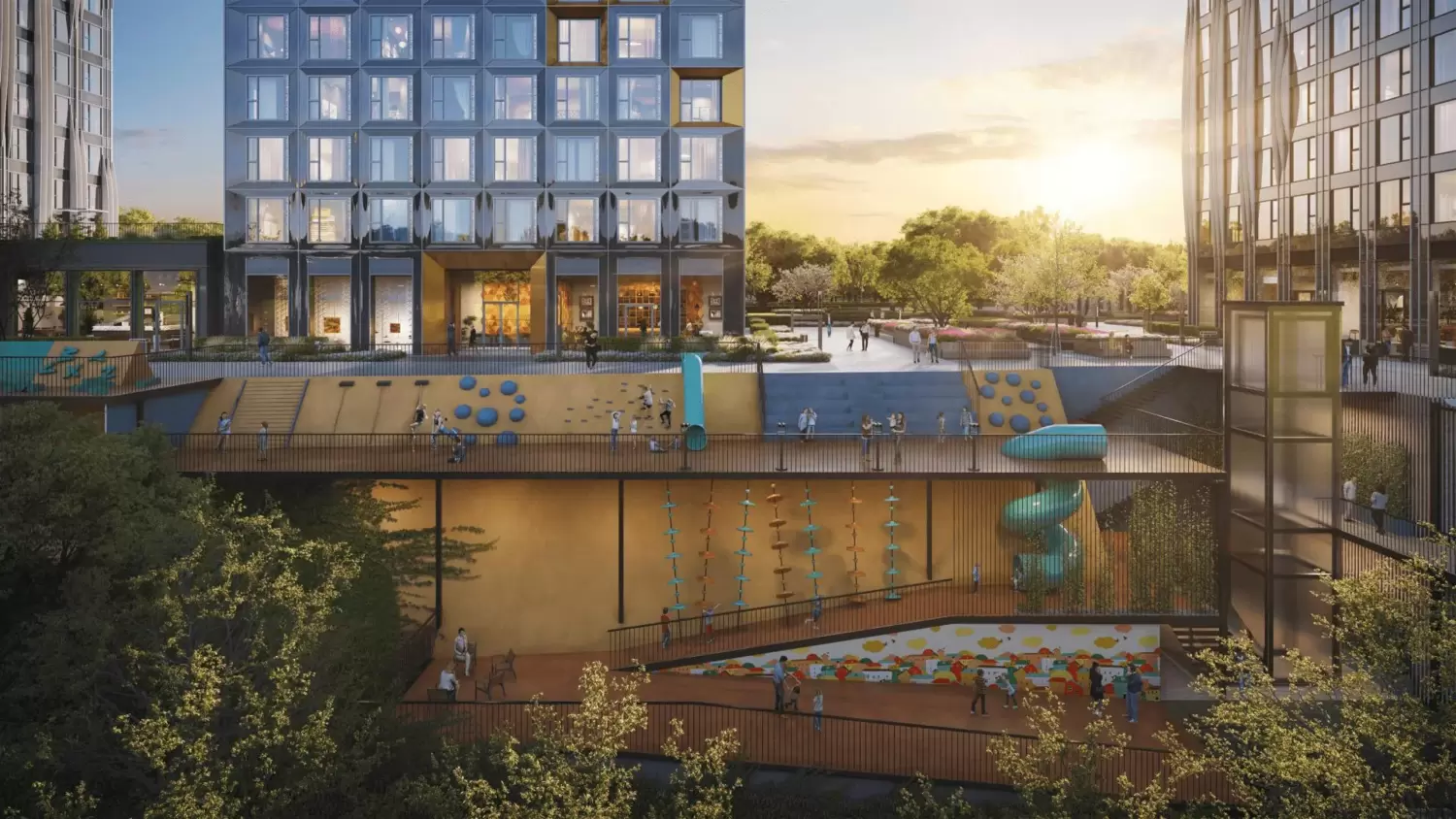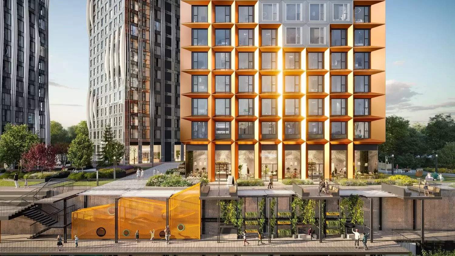 На первых этажах разместятся фитнес-центр, супермаркет, ресторан и кафе.