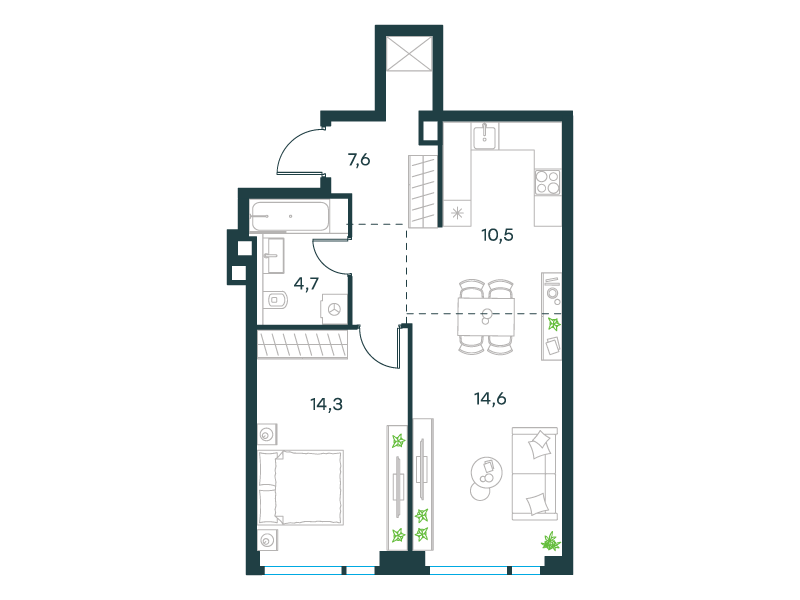 42.8 м² · 2 комнаты · 35/37 этаж · Март 2025