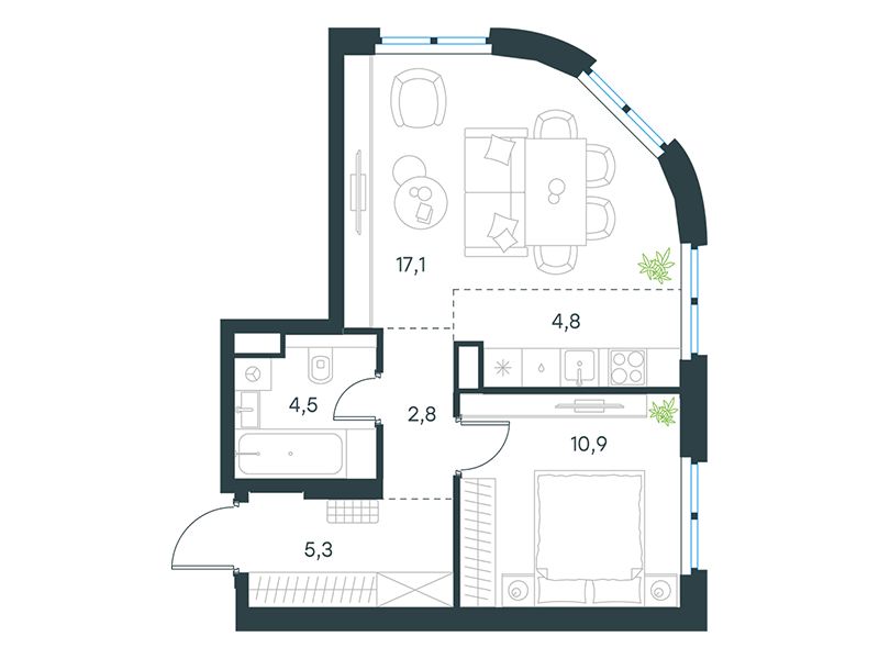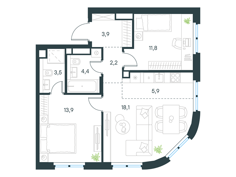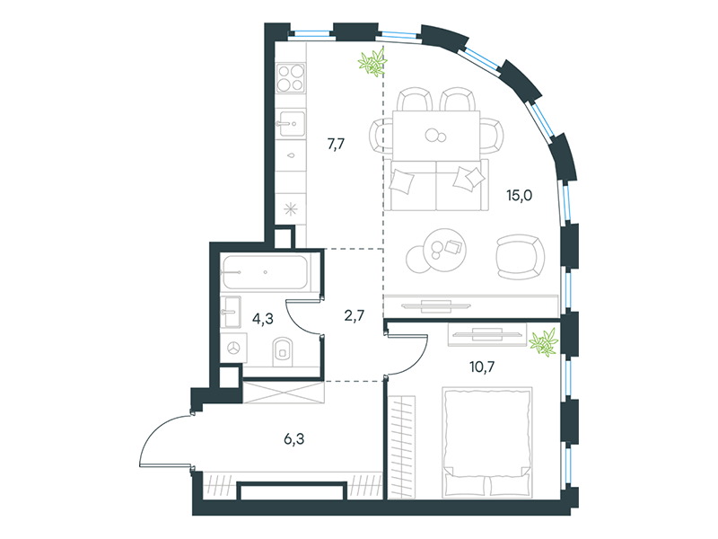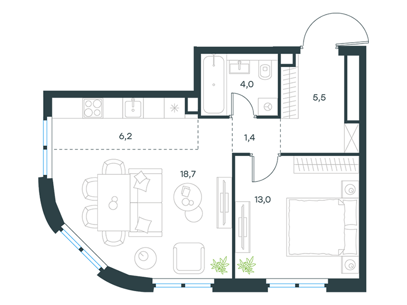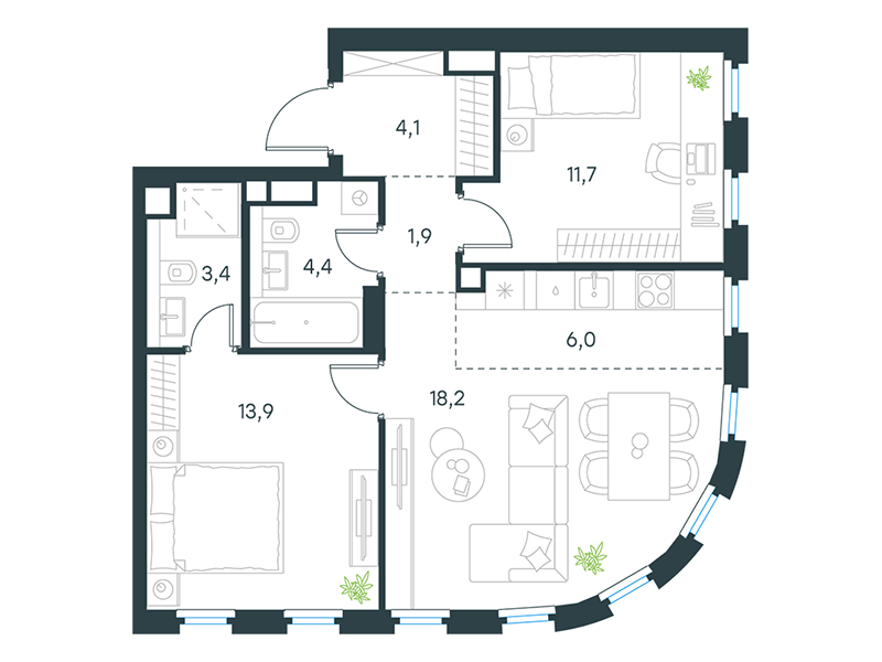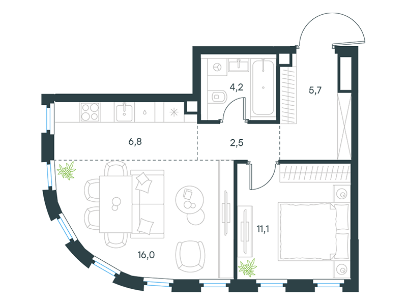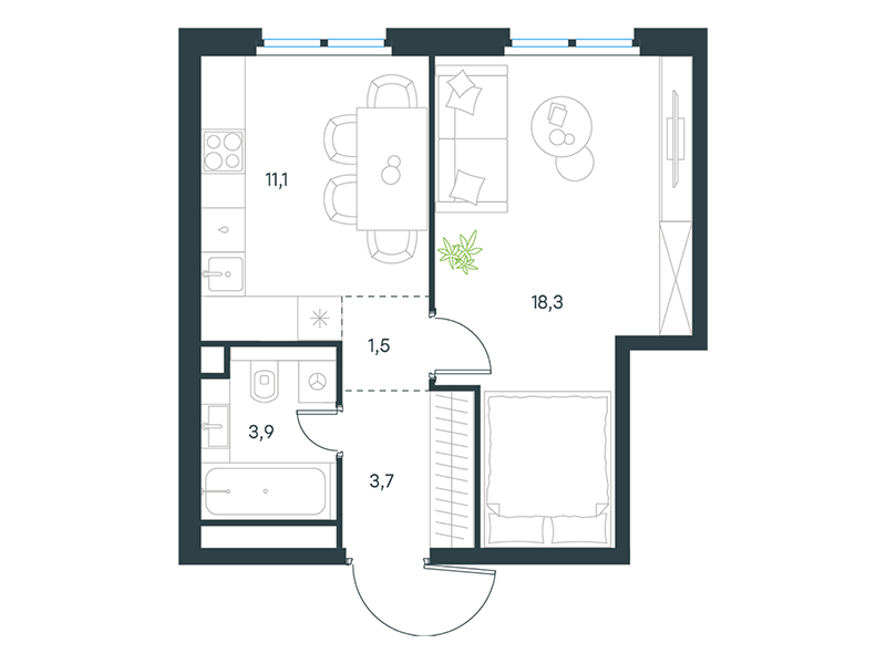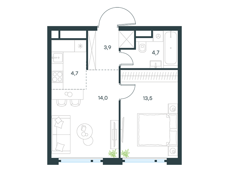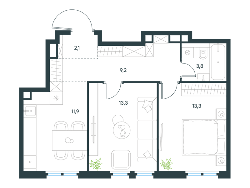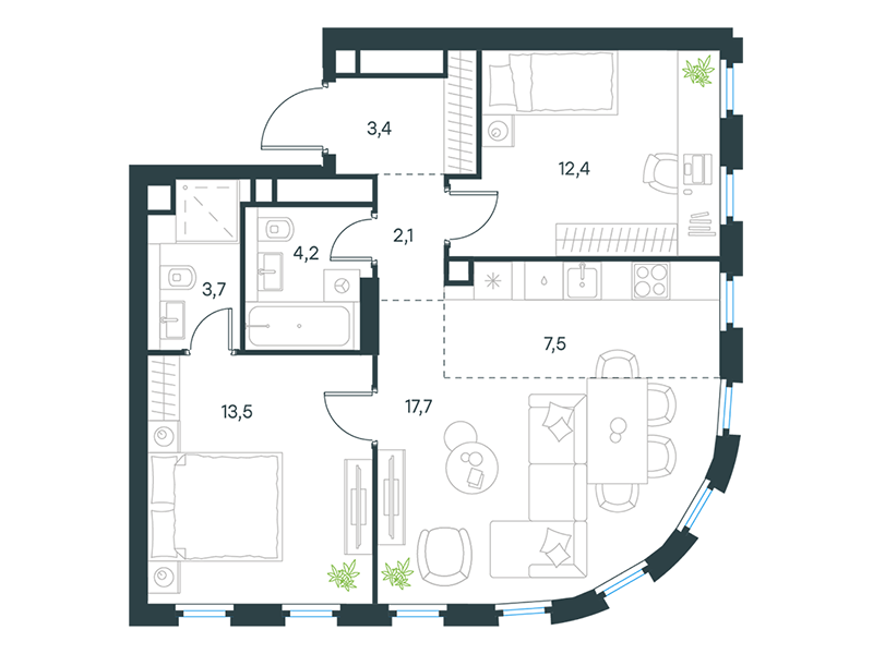 В ЖК представлено более 35 вариантов продуманных планировок – от компактных студий площадью от 21 кв. м. до просторных четырехкомнатных квартир до 91 кв. м. Высота потолков достигает 2,85 м. Проект включает востребованные форматы: квартиры с окном в ванной комнате и с увеличенным количеством окон.