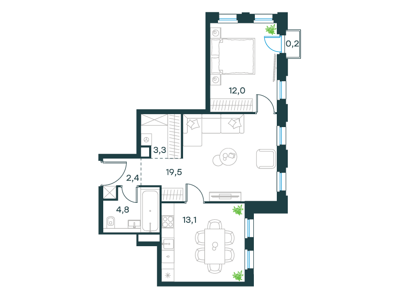 • Широкий выбор планировок – от студий до квартир с мастер-спальней, включая редкие форматы с террасой.