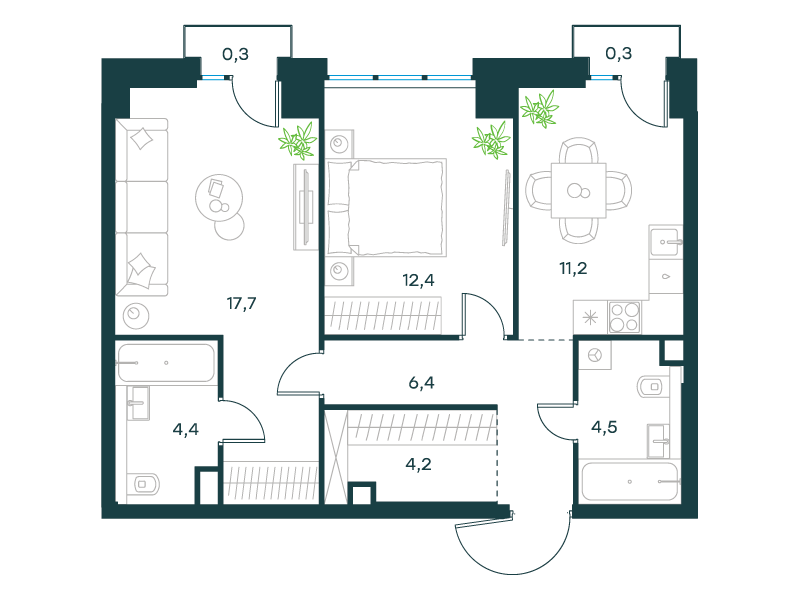 • Широкий выбор планировок – от студий до квартир с мастер-спальней, включая редкие форматы с террасой.