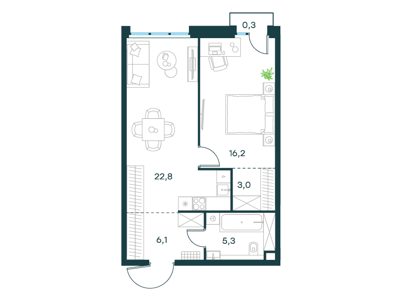 • Широкий выбор планировок – от студий до квартир с мастер-спальней, включая редкие форматы с террасой.