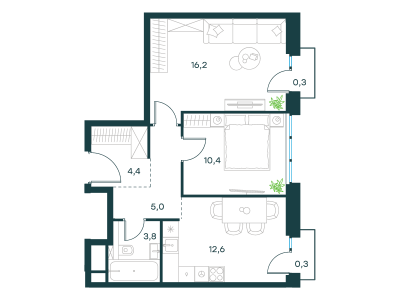 • Широкий выбор планировок – от студий до квартир с мастер-спальней, включая редкие форматы с террасой.
