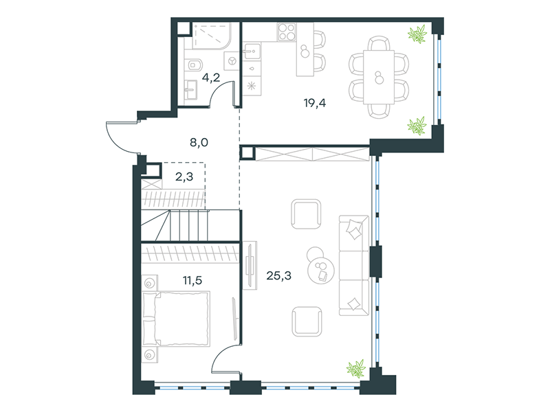| 8 - (этап 1.2) | Май 2029 | 1 | 25 | 2 | 2 | 1 | 42.4 | 19 300 652 | без отделки | ![]() | 2 | ||