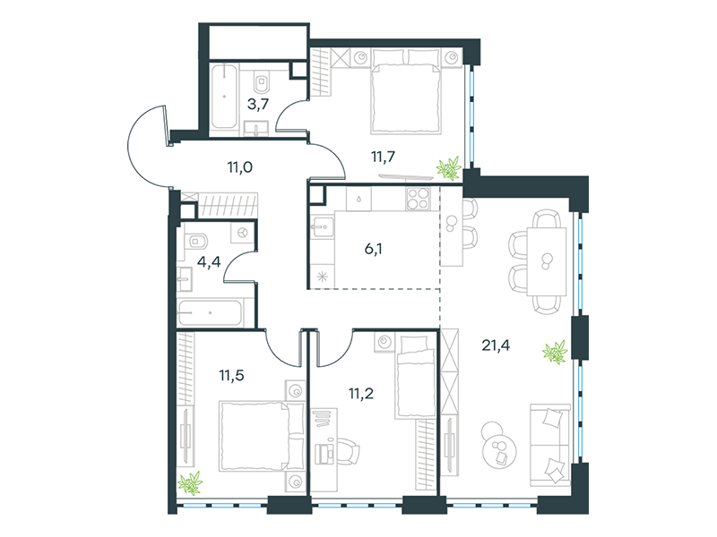 | 12 - (этап 3) | Июнь 2029 | 1 | 3 | 4 | 4 | 1 | 35.4 | 16 436 654 | без отделки | ![]() | 4 | ||
