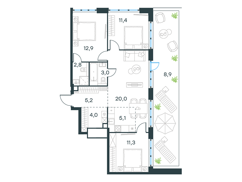 | 9 - (этап 1.2) | Июнь 2029 | 1 | 11 | 8 | 8 | 3 | 95.7 | 31 833 865 | с отделкой | ![]() | 8 | ||