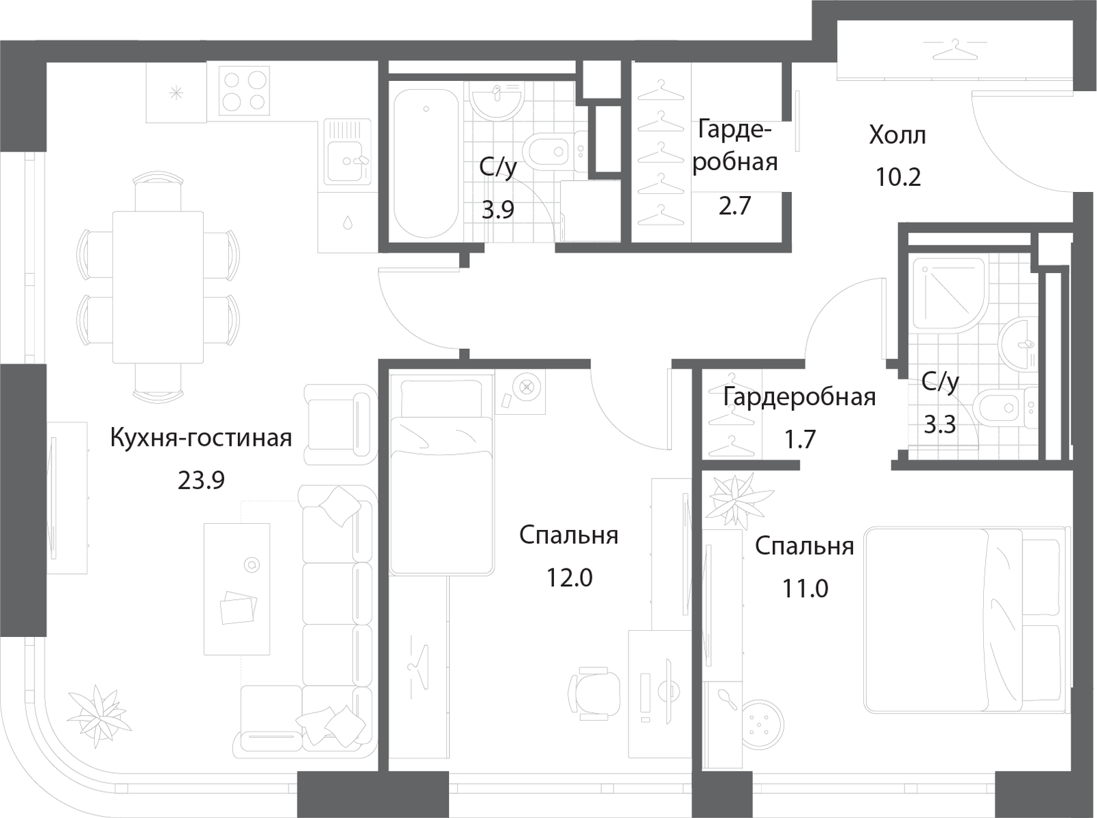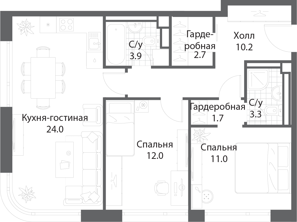 68.6 м² · 2 комнаты · 33/35 этаж · Июнь 2027