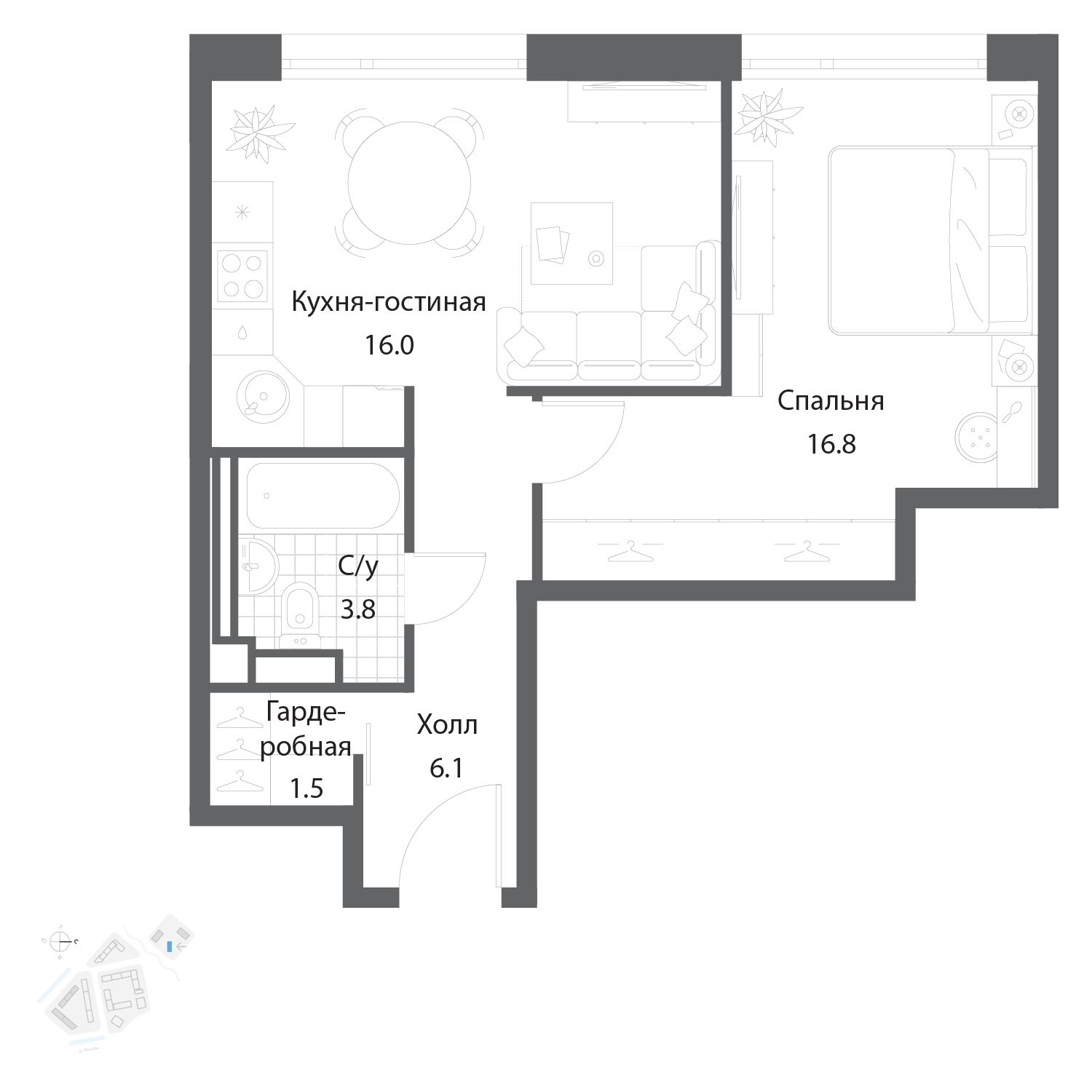 43.8 м² · 1 комната · 33/35 этаж · Июнь 2027