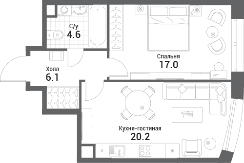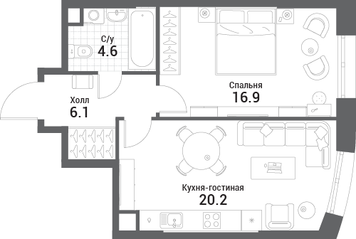 46.3 м² · 1 комната · 21/35 этаж · Июнь 2027