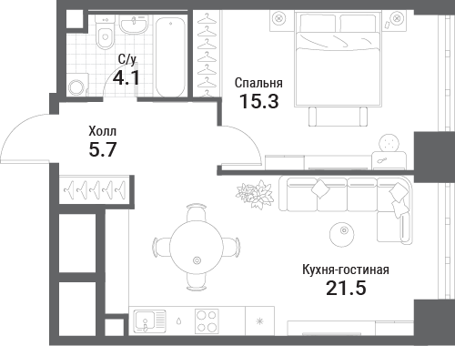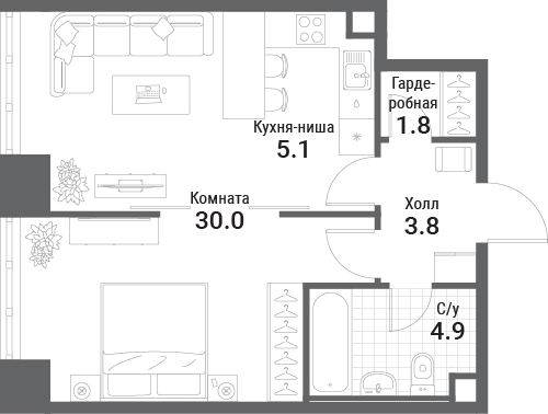 49.1 м² · 1 комната · 18/19 этаж · Июнь 2027