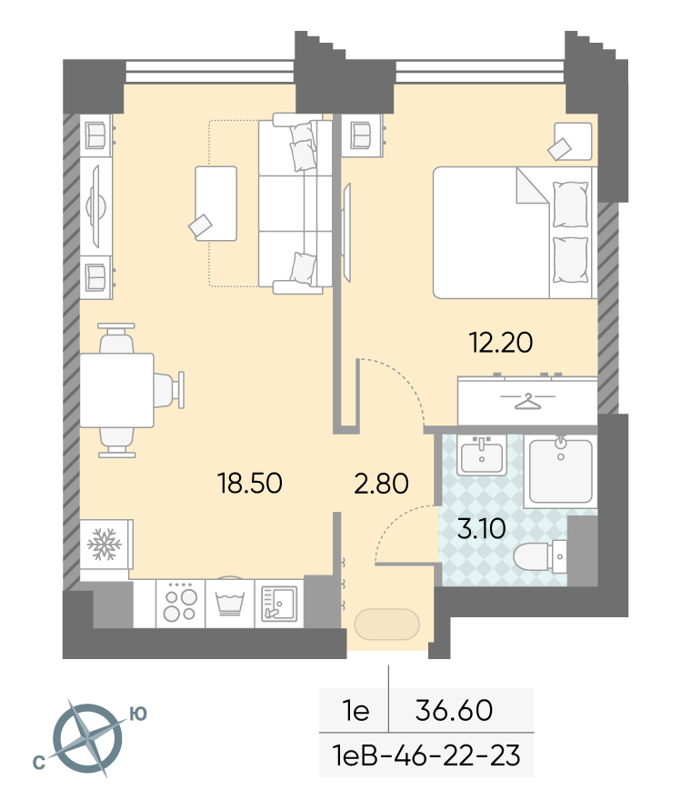 36.1 м² · 1 комната · 25/58 этаж · Декабрь 2026