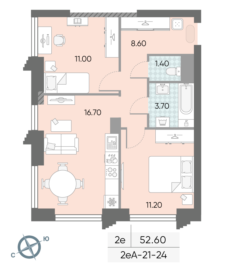 52.6 м² · 2 комнаты · 25/58 этаж · Декабрь 2026