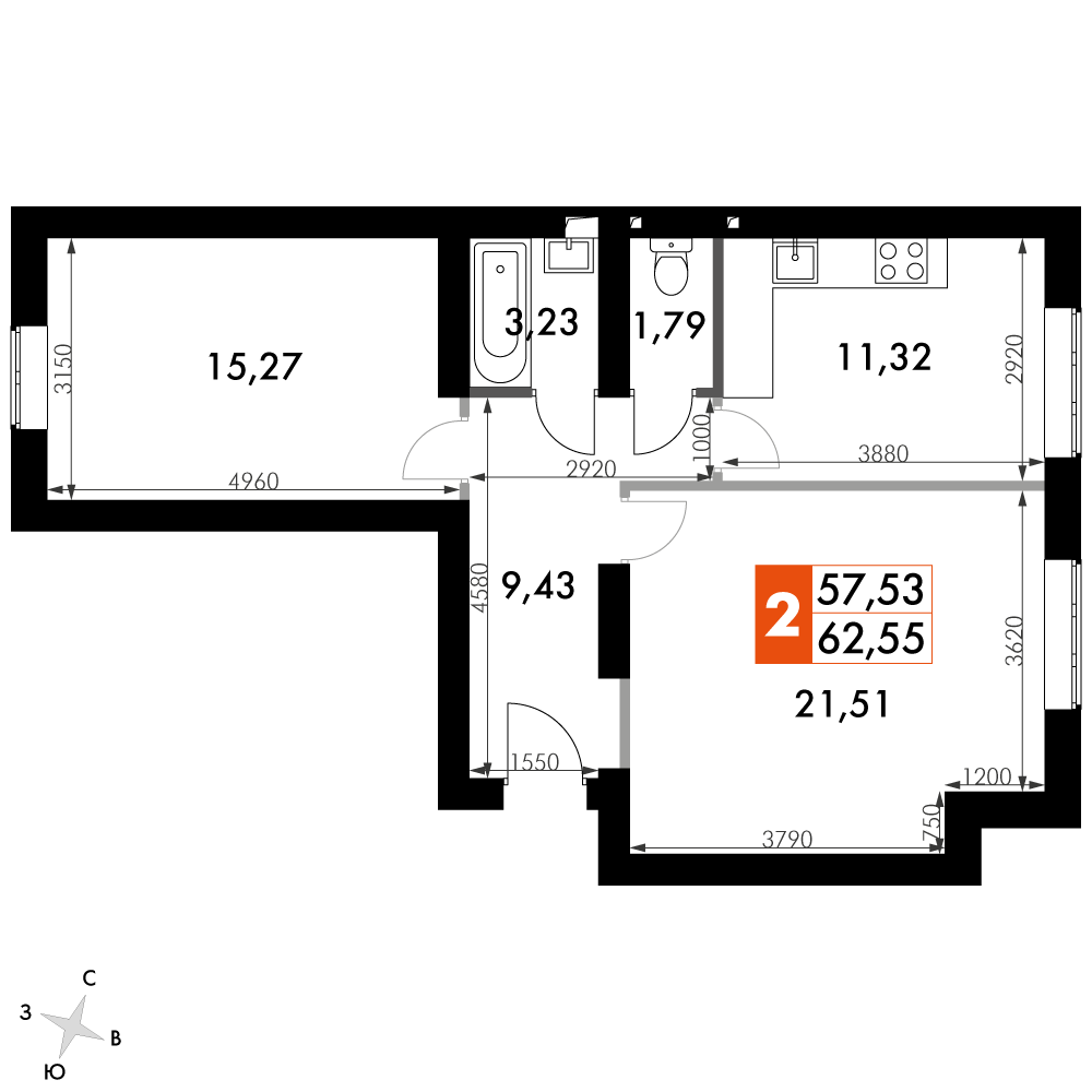 | 45 | Декабрь 2024 | 2 | 1 | 3 | 3 | 1 | 51.2 | 14 592 000 | без отделки | 3 | |||
