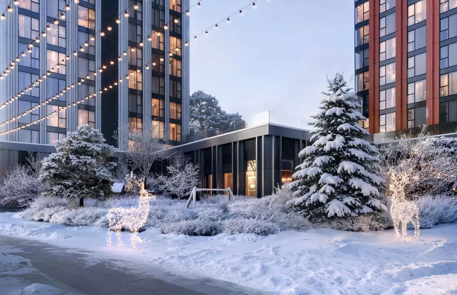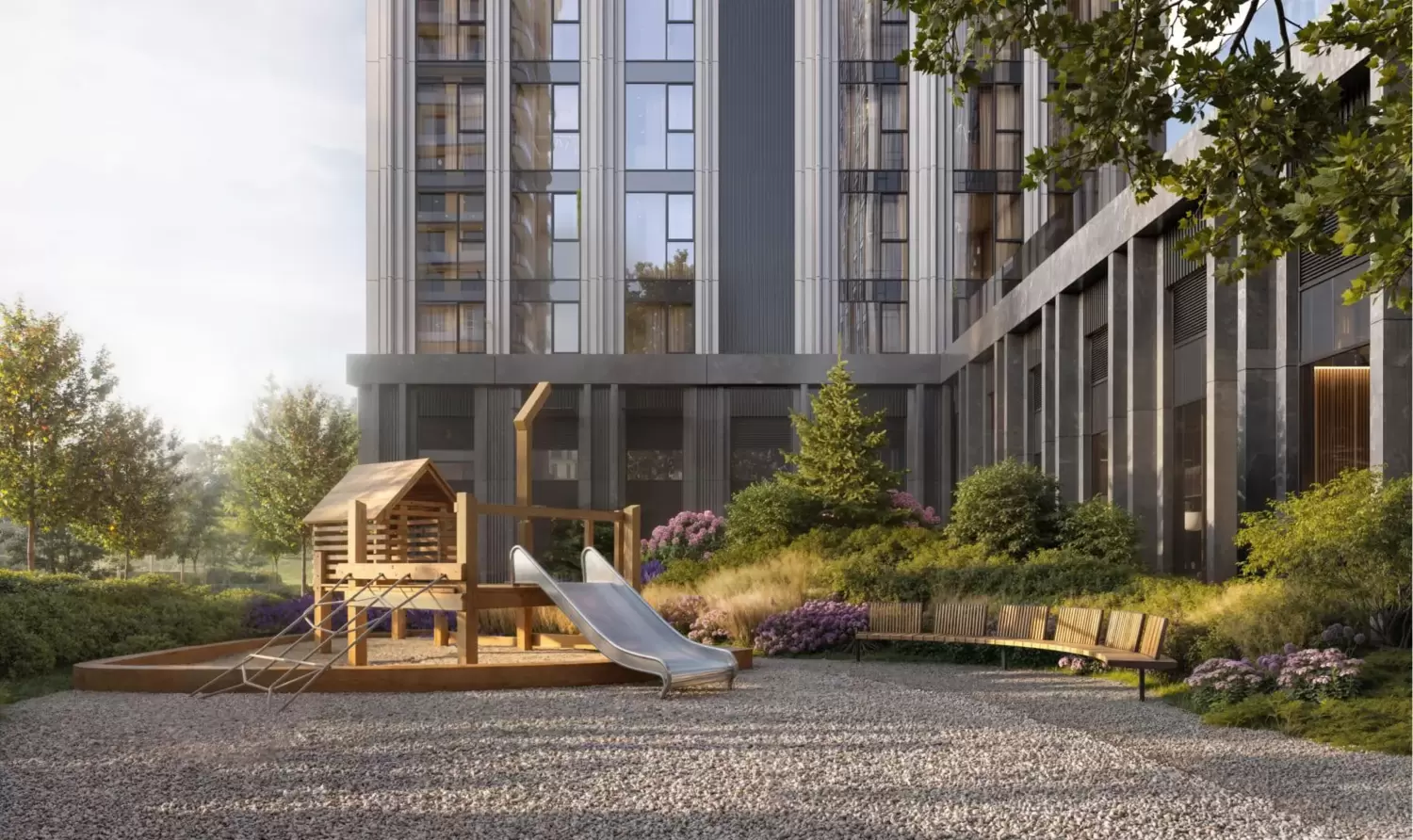 Территория включает несколько тематических зон. Для активного досуга предусмотрены современные спортивные площадки и специализированные детские игровые комплексы, безопасные и рассчитанные на разные возрастные группы. Для спокойного времяпрепровровождения созданы тихие зеленые уголки с местами для отдыха, а также открытые зоны для работы и неформальных встреч с доступом к Wi-Fi. Продуманный ландшафтный дизайн с разнообразными видами деревьев, кустарников и сезонных растений обеспечивает круглогодичную привлекательность и уют.