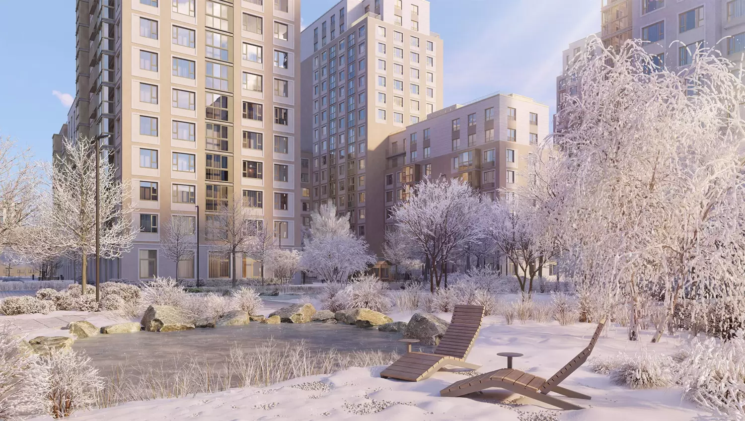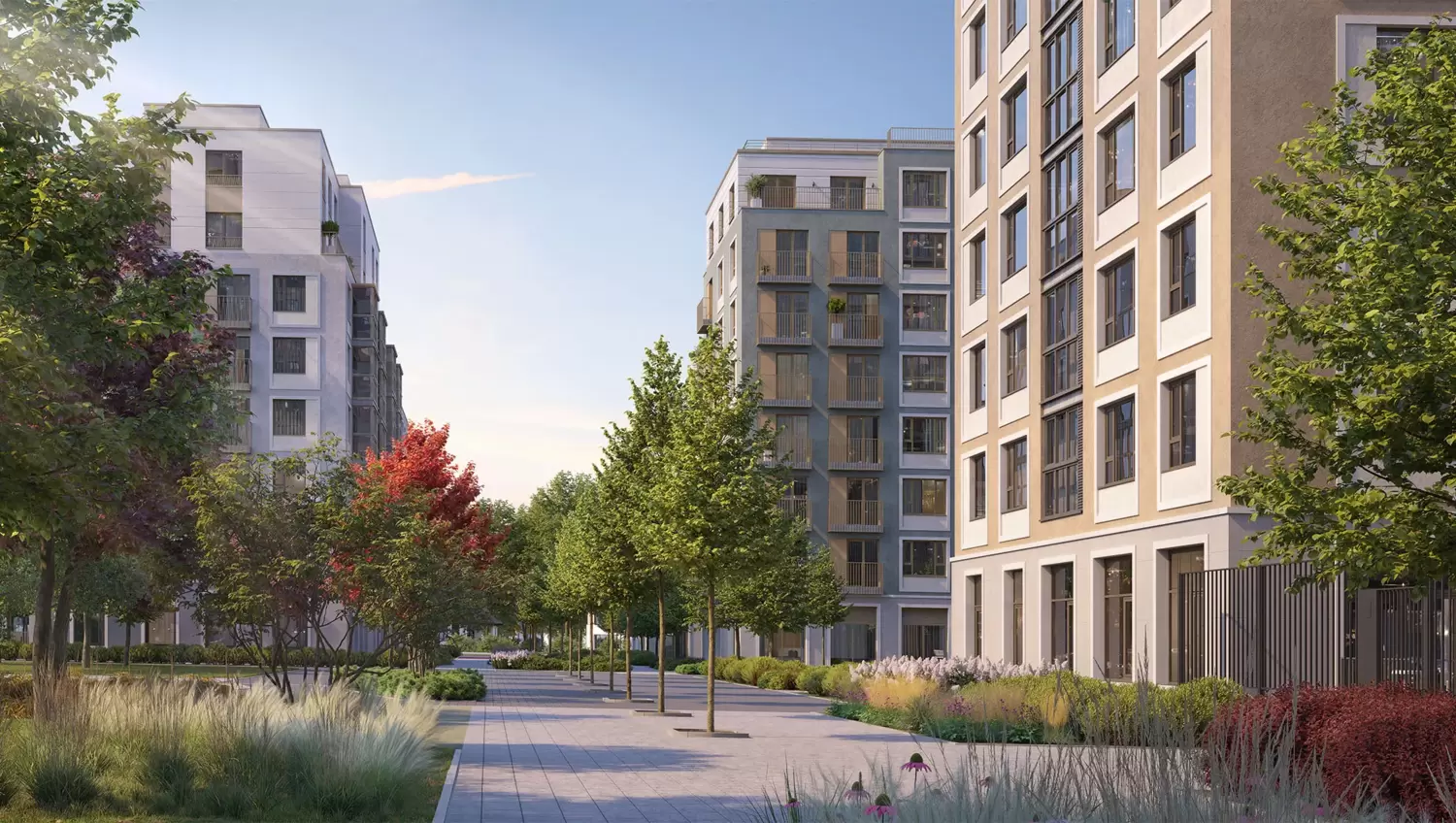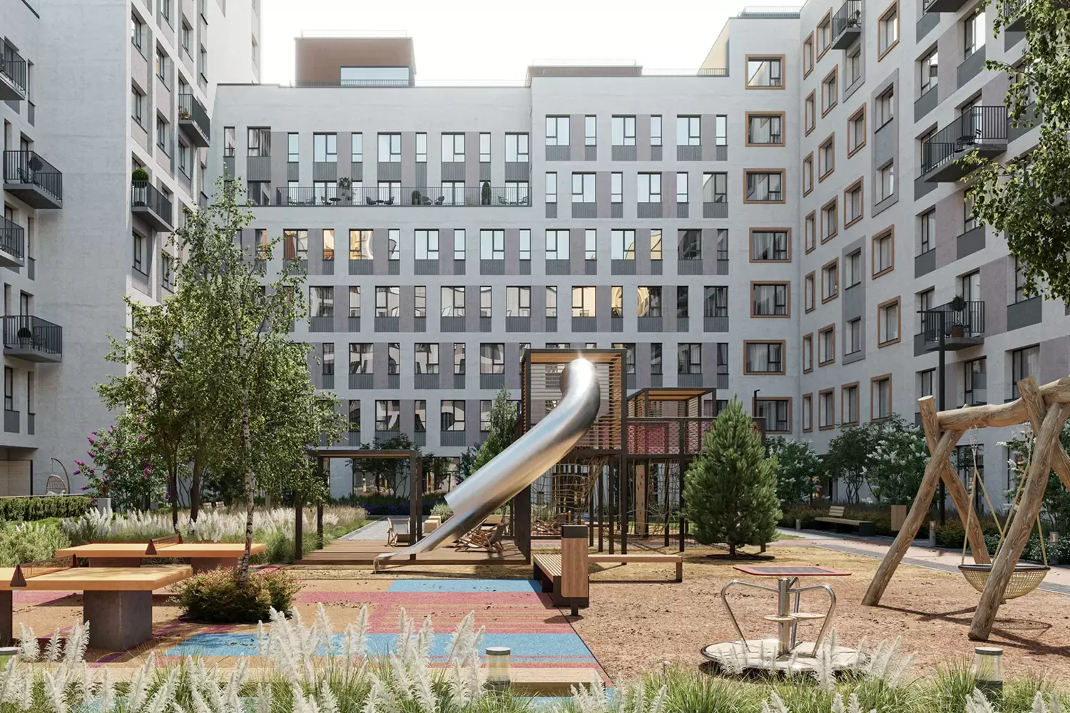 Архитектурно-ландшафтная концепция проекта заслуживает отдельного внимания. Уникальная среда ЖК «Первый квартал» – яркое тому подтверждение. Здесь нет шаблонных решений: от детских садов, напоминающих конструктор из разноразмерных модулей с необычным ландшафтом, до «школы-невидимки», мастерски вписанной в сложный рельеф. Благоустройство выполнено в эко-стиле с обилием натуральных материалов и сдержанных природных тонов. Улицы, дворы и парки – это продуманное продолжение жилого пространства, где каждый элемент служит комфорту и эстетическому удовольствию жителей.