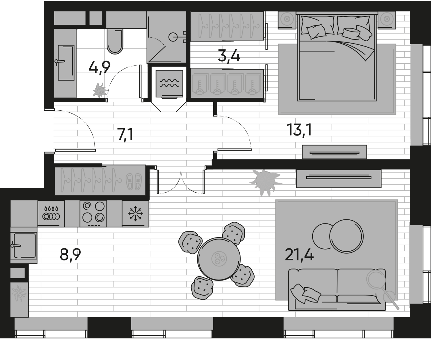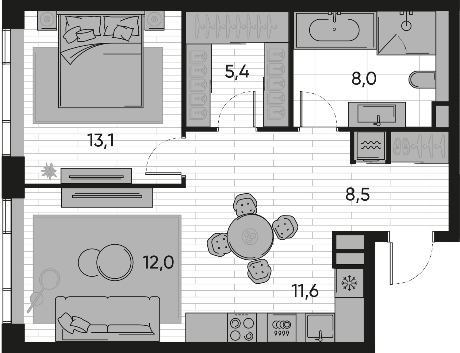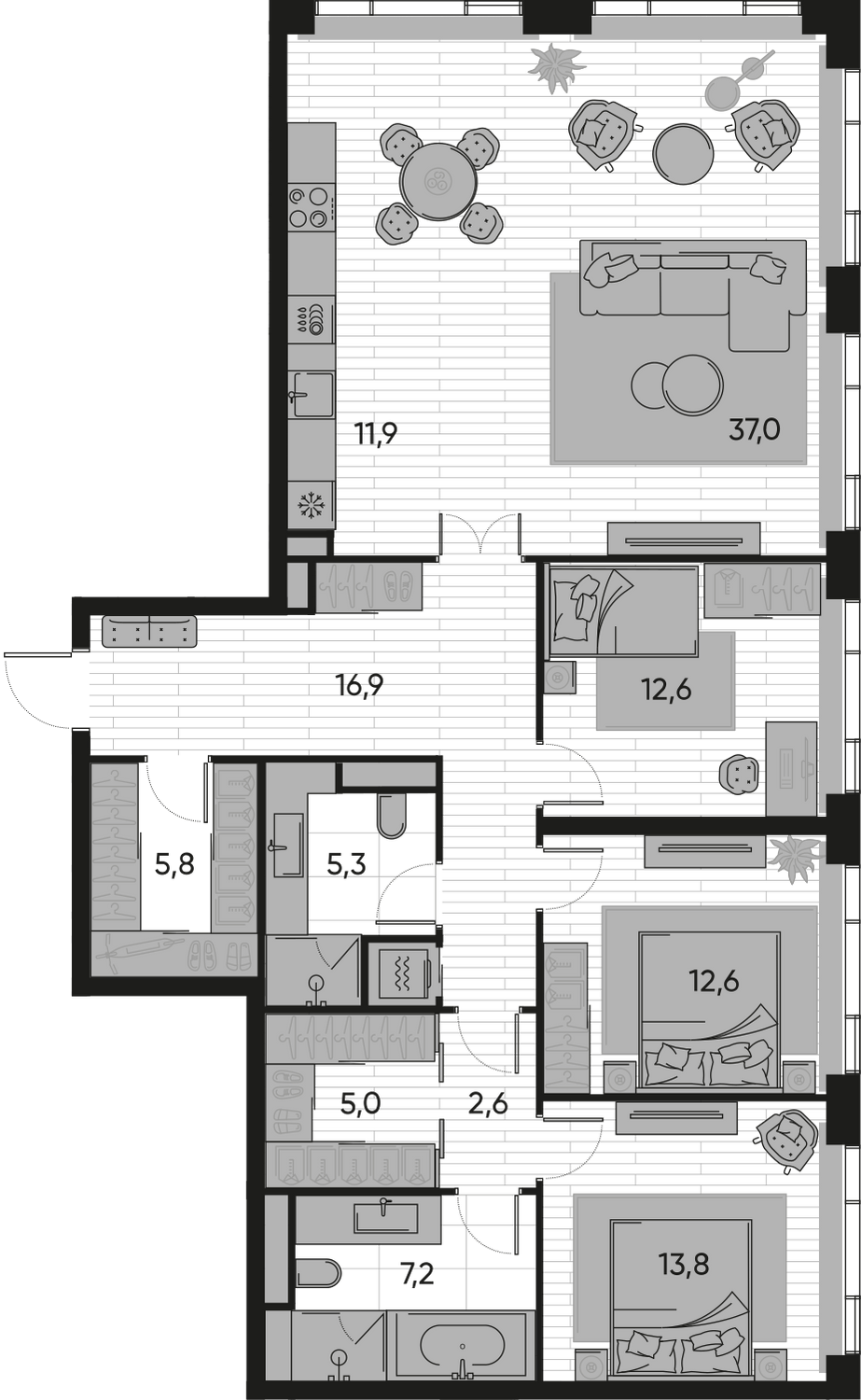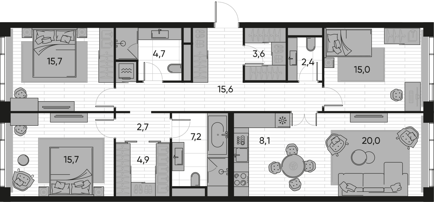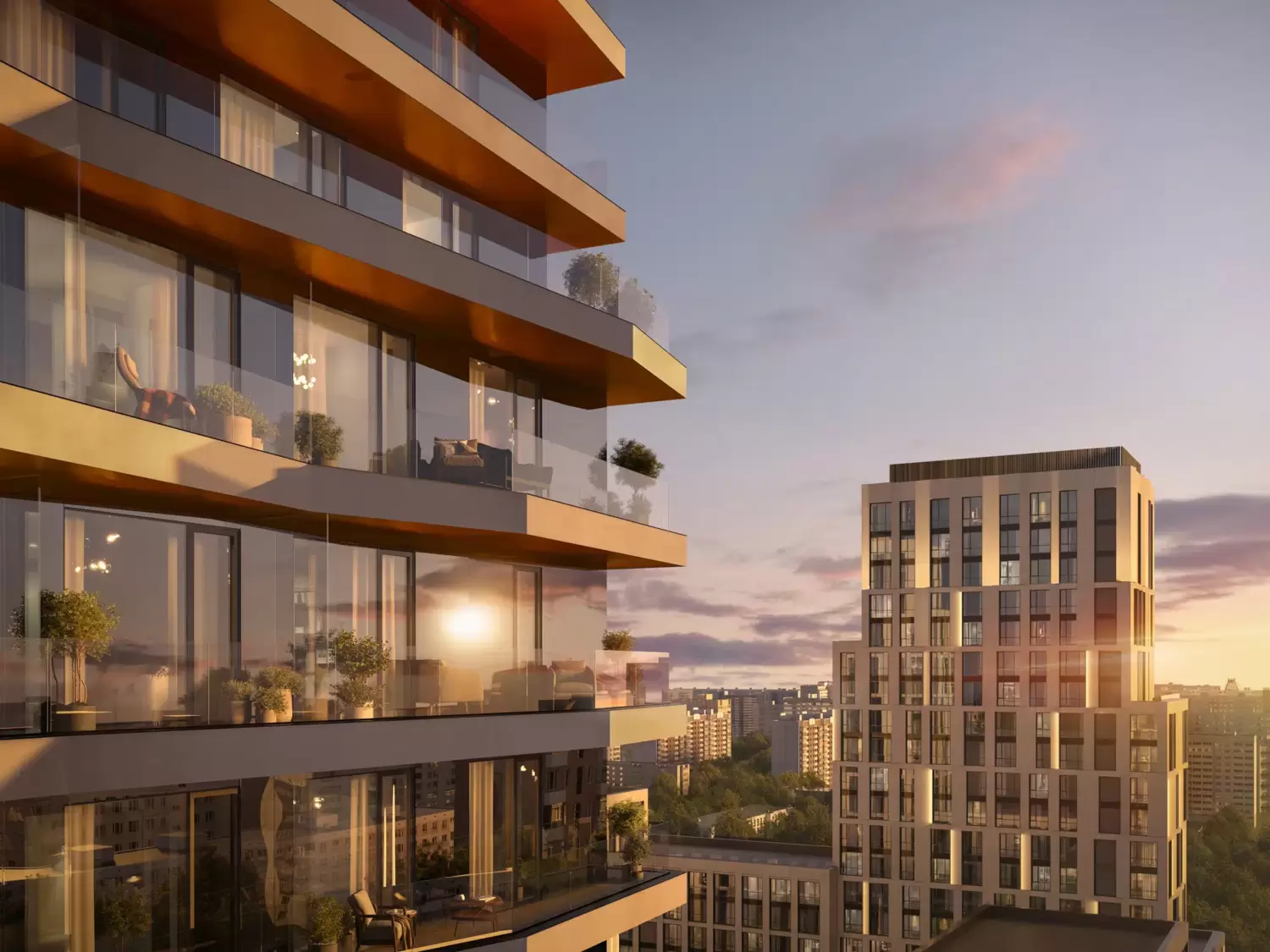 Внутреннее пространство квартир спроектировано для максимального комфорта. Большие панорамные окна наполняют комнаты естественным светом и открывают видовые перспективы, а просторные террасы становятся дополнительной жилой зоной на свежем воздухе. Покупателям предлагается широкий выбор планировок: от компактных студий площадью от 30,7 кв. м до просторных квартир с террасами до 135 кв. м. Среди решений есть редкие форматы, например, квартиры с окнами в ванных комнатах и видами на три стороны света. Квартиры доступны как без отделки, так и с готовой премиальной отделкой на выбор в двух дизайнерских стилях.