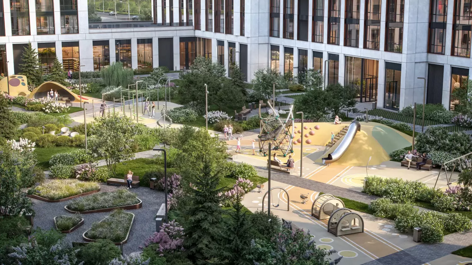 Общественные пространства PRIDE организованы по принципу многофункциональности и уюта, разделяясь на открытые и камерные зоны. Центральной артерией квартала станет широкий пешеходный бульвар площадью 3500 кв. м — место для прогулок, неспешного отдыха и общественных мероприятий. Дополняют его два приватных внутренних двора, каждый из которых имеет свою тематику и атмосферу. Здесь соседствуют современные спортивные и детские игровые площадки с тихими, уединенными уголками для чтения или общения. Особое внимание уделено ландшафтному дизайну. Многоуровневое озеленение с использованием нескольких десятков видов растений обеспечивает живописный вид и буйство красок в течение всех сезонов года, создавая ощущение живой, пышной природы прямо в городе.