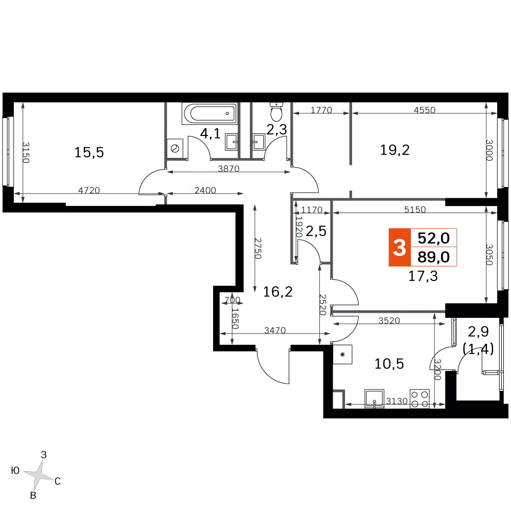 87.9 м² · 3 комнаты · 19/43 этаж · Объект сдан