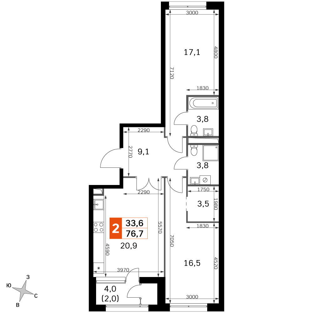 76.7 м² · 2 комнаты · 41/44 этаж · Июнь 2027