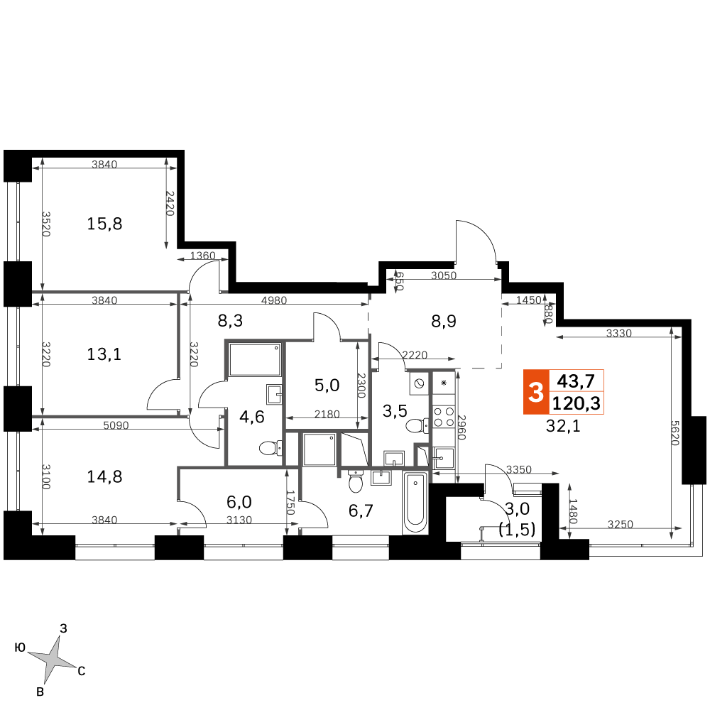116.3 м² · 3 комнаты · 17/44 этаж · Июнь 2027