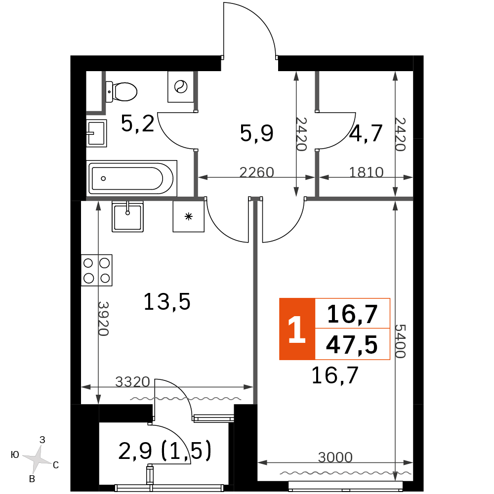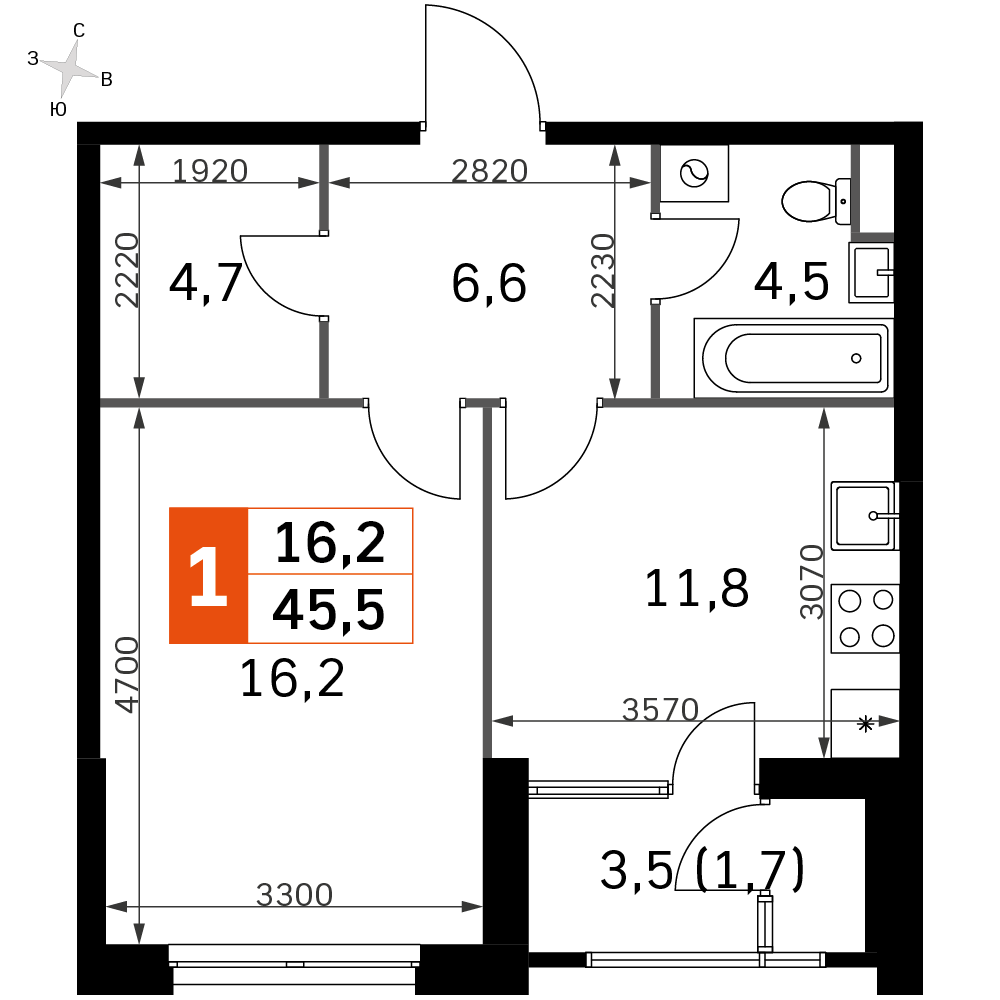 42.6 м² · 1 комната · 17/43 этаж · Объект сдан
